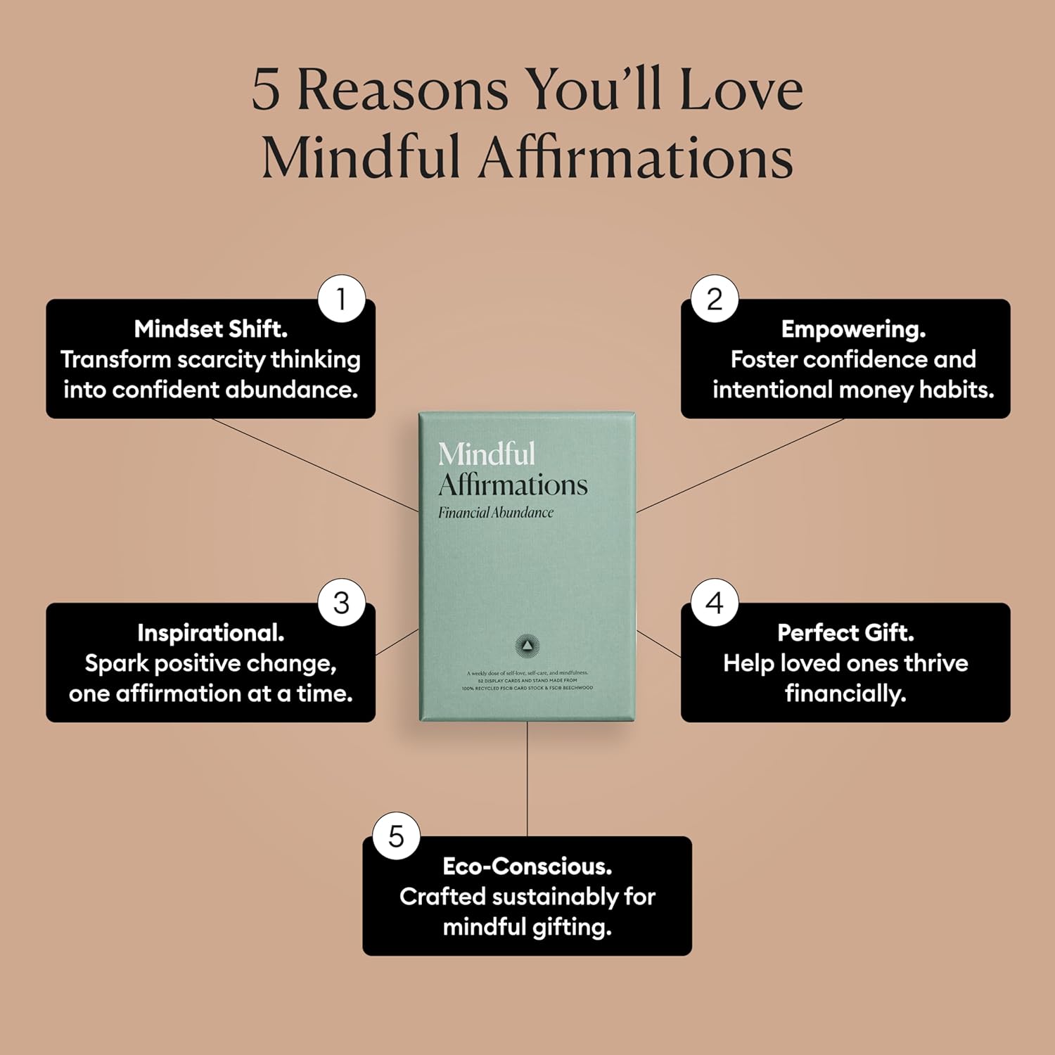 - Display Your Affirmations Cards - Every purchase includes 52 financial abundance affirmation cards and a display stand. Bring your affirmation deck with you wherever you go, pull out a card, place it on the stand, then recite the message to manifest all good intentions.