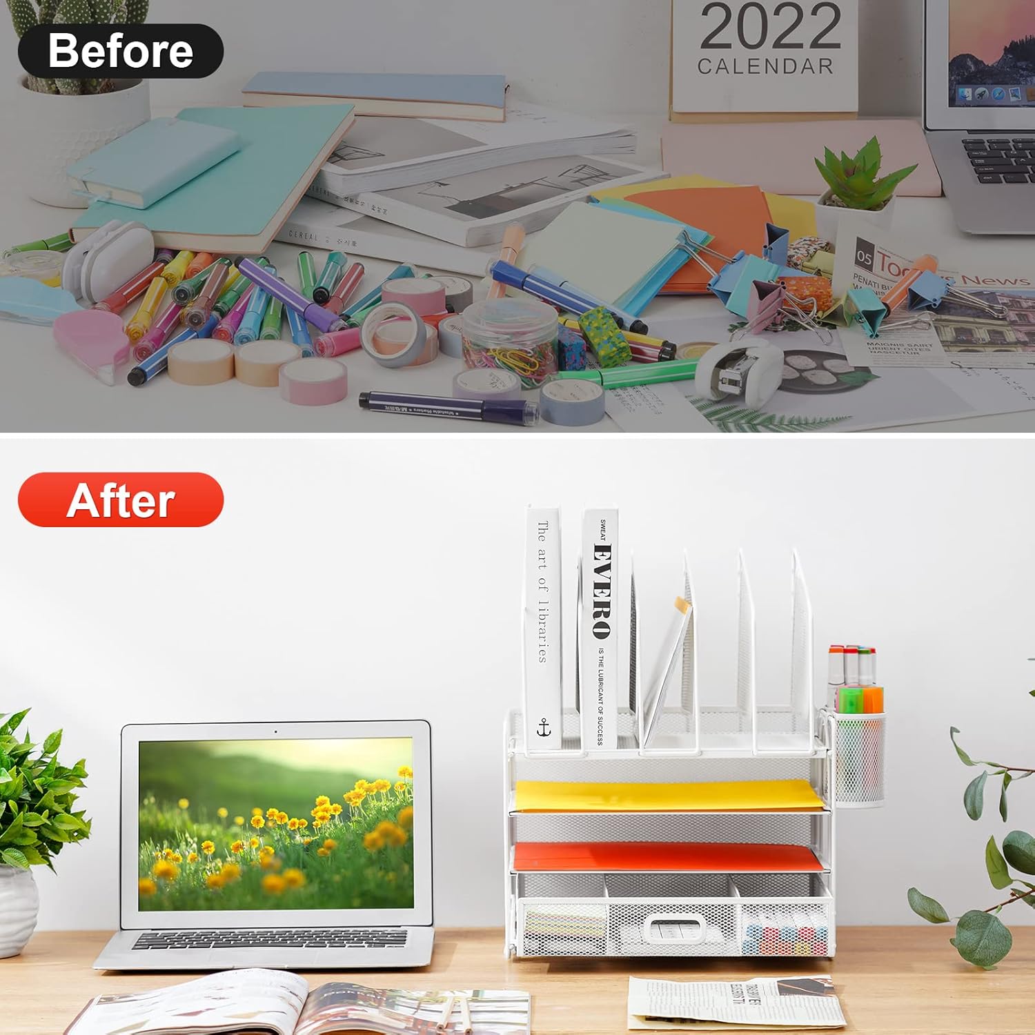 - 【Space Saving】Outfit your space with the Hanging Pencil Holder (Built-in Hooks) and top vertical file folder holder, which offers everything you need and make the most of your vertical and horizontal space to keep your desk neat so you can stay on task and do great work