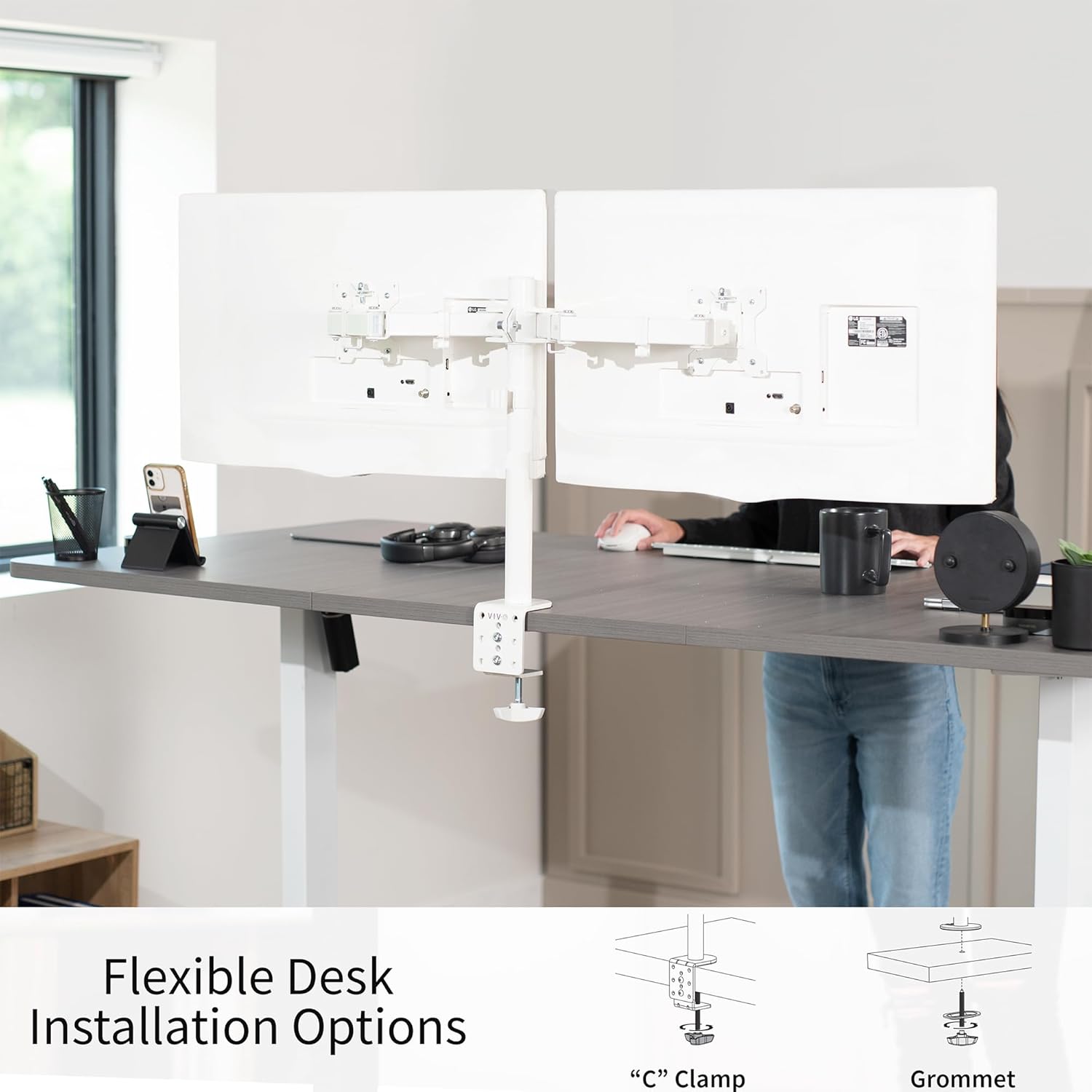 - Heavy Duty C-Clamp - Mounts to the back of your desk (up to 8.3cm thick) via a heavy-duty C-clamp or optional grommet mount.