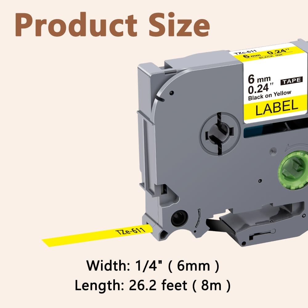 - Product features - The replacement compatible for Brother p-touch label tape 6mm TZe-611 TZe611 is split back, water resistant, fading resistant, abrasion resistant, temperature resistant, strong adhesive. The 6mm black on yellow tape TZe-611 TZe611 is suitable for indoor and outdoor use