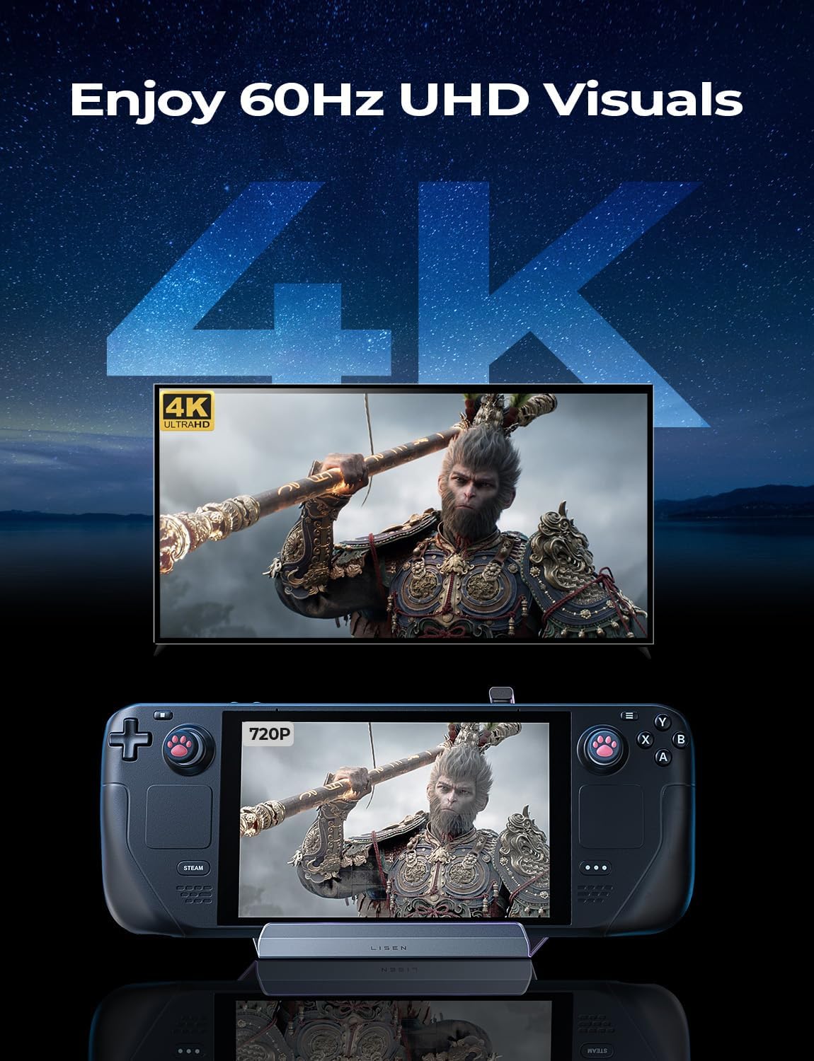 - 4K@60Hz HDMI Output: The Steam Deck Dock comes with a 4K@60Hz HDMI 2.0 output. When you connect an external 4K monitor, it can provide you sharper and smoother visual experience, so you can enjoy the visual feast on your games.