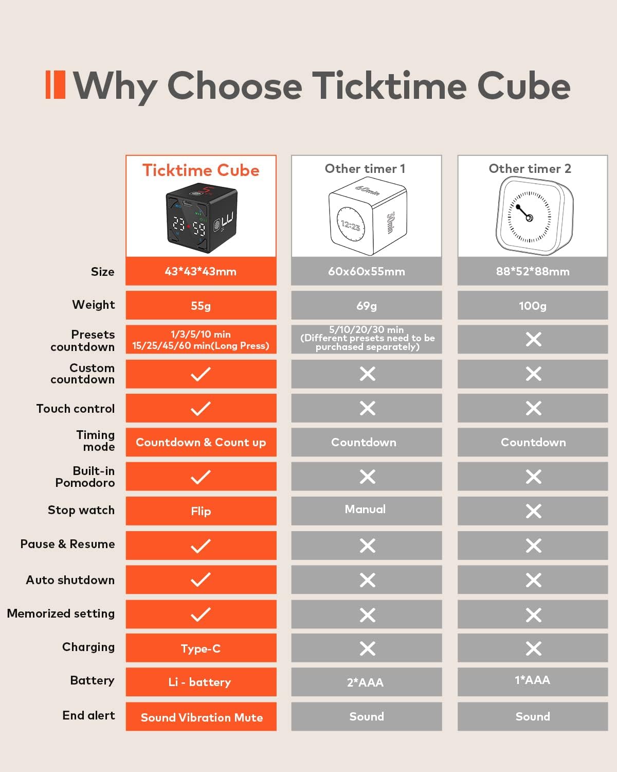- Multiple Timing Modes. The cube timer offers countdown, count-up & pomodoro modes. Besides the 8 preset countdown and custom countdown, you can start count-up mode by placing the timer bottom up, and stop it by standing the screen up. Pomodoro mode is activated by long-pressing the fingerprint icon on the number 5 side. The timer notifies you every 25 min of work and a 5-min break, to keep you focused and productive. The timer range is 00:01 to 99:59. Easy timer setup for maximum comfort.