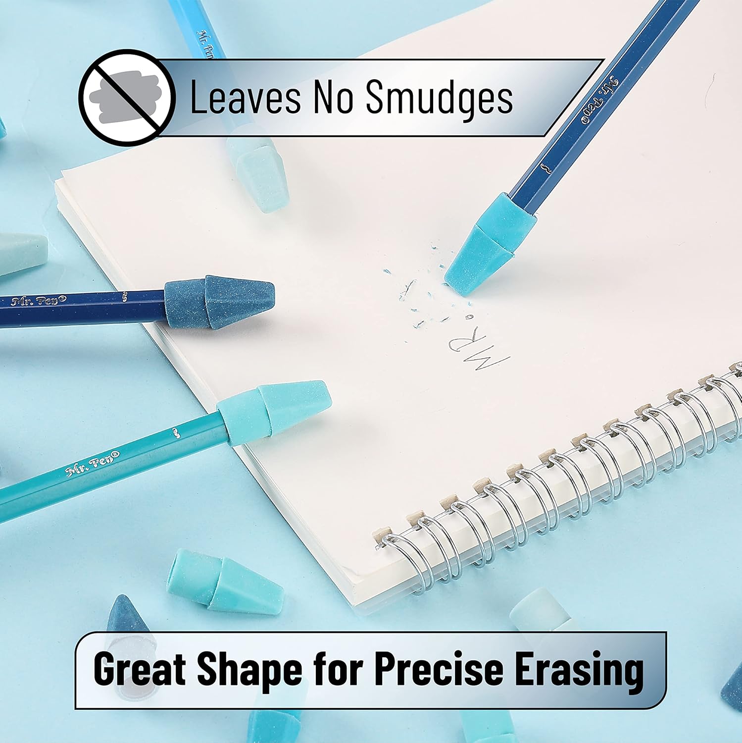 - Package includes 120 pencil top erasers in 4 different blue shades. They can also be the protective cap for pens or pencils, prevent tips from breaking, and make clean corrections to office documents and homework.