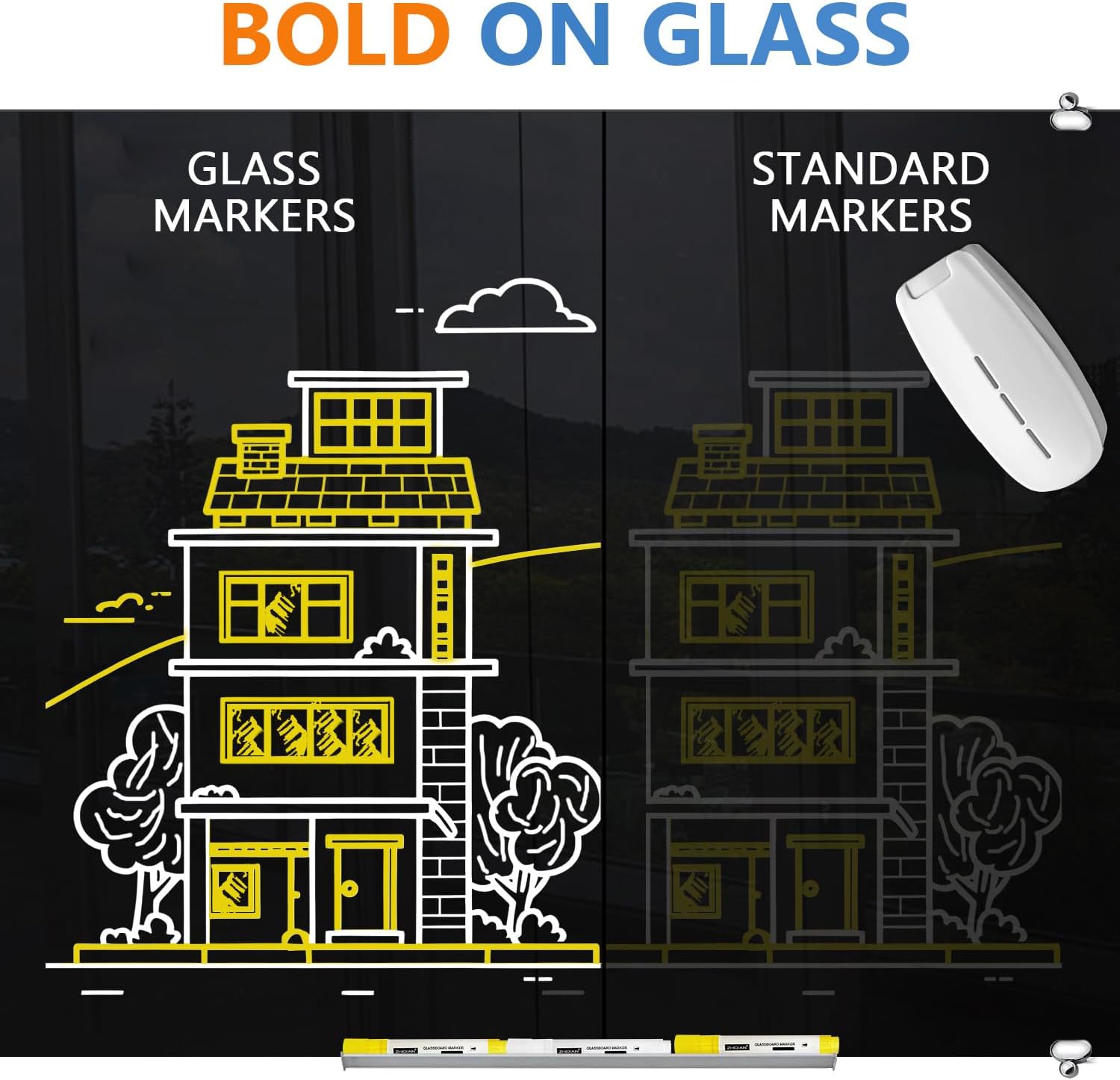- 【DUSTLESS ERASER & BOLD MARKERS】- Erase with less effort, simply glide this eraser over a chalkboard with no vigorous scrubbing. Bright glass window markers are designed for black glass boards. Markers delivers strong bold color every time, to ensure that your message is distinct and legible, or making your window painting stand out with unmatched brightness