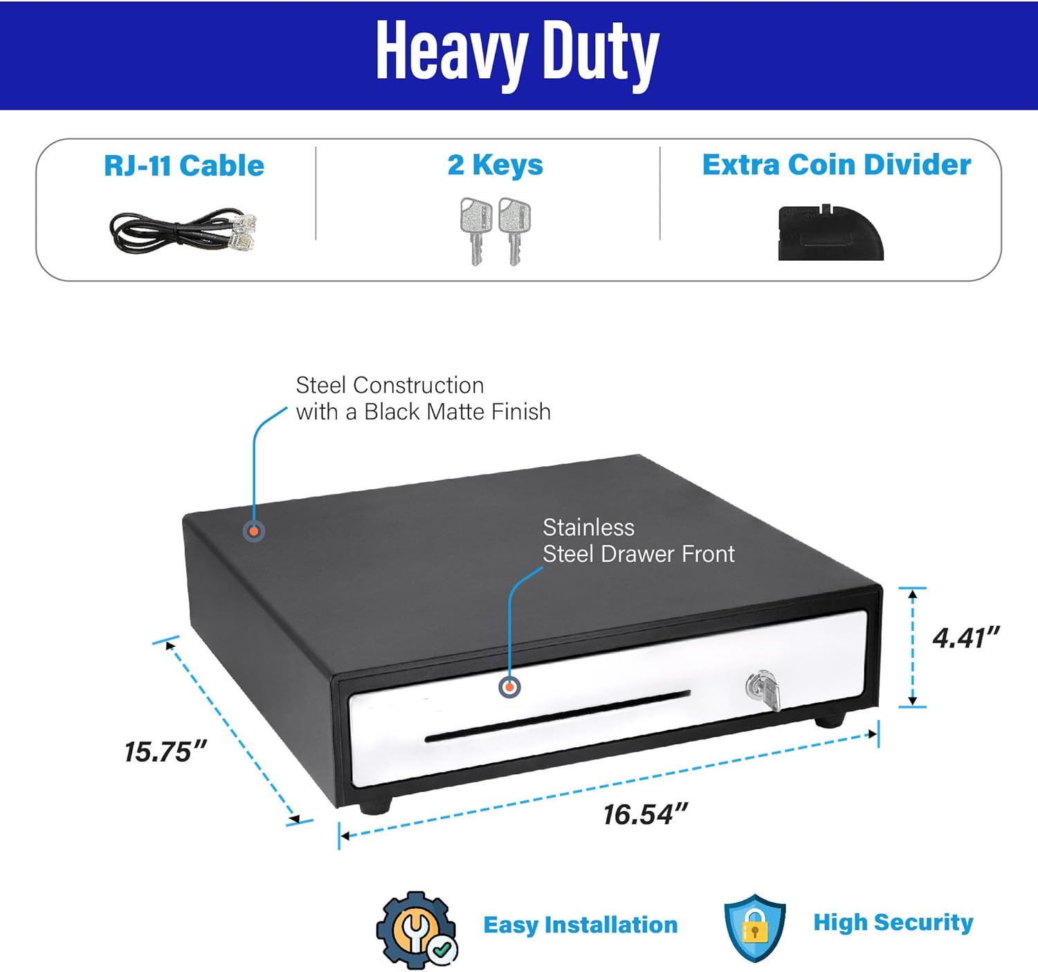 - 📦Stainless Steel Front & Movable Till: This cash drawer not only ensures security but also adds a touch of durability with its Stainless Steel Front. Customize your cash organization with the movable till, providing flexibility to adapt to your business needs.