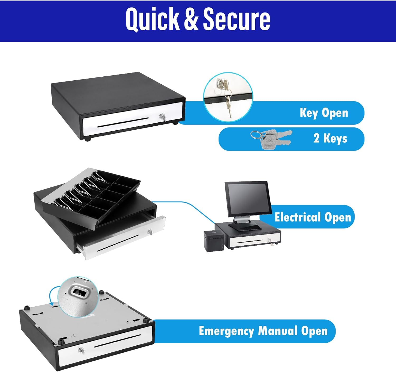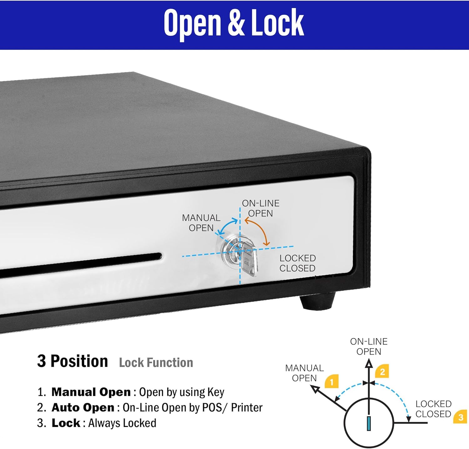 - 💳3-Position Lock& Single Large Front Media Slot: This cash drawer ensures the highest level of security with a 3-position lock mechanism: 1-Lock, 2-Auto Open by Printer/POS, 3-Emergency Manual open