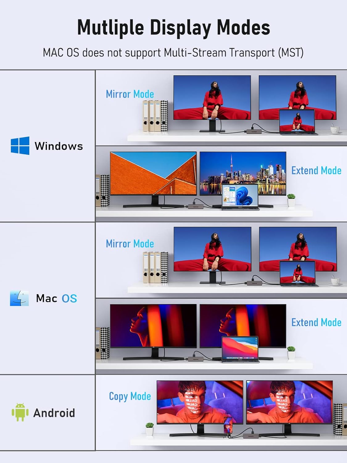 - [4K Dual Screen Display Hub] This ultra-thin USB C dual HDMI adapter supports mirrored or extended modes and provides crystal-clear 3D visuals and high-quality video experiences through its 2 HDMI ports. In Windows systems, dual HDMI ports can achieve three-screen displays in A-B-C mode, while in macOS systems, they can only achieve dual-screen displays in A-B-B mode. It can help you display different pages on two monitors, allowing for special applications such as comparing table data, images.