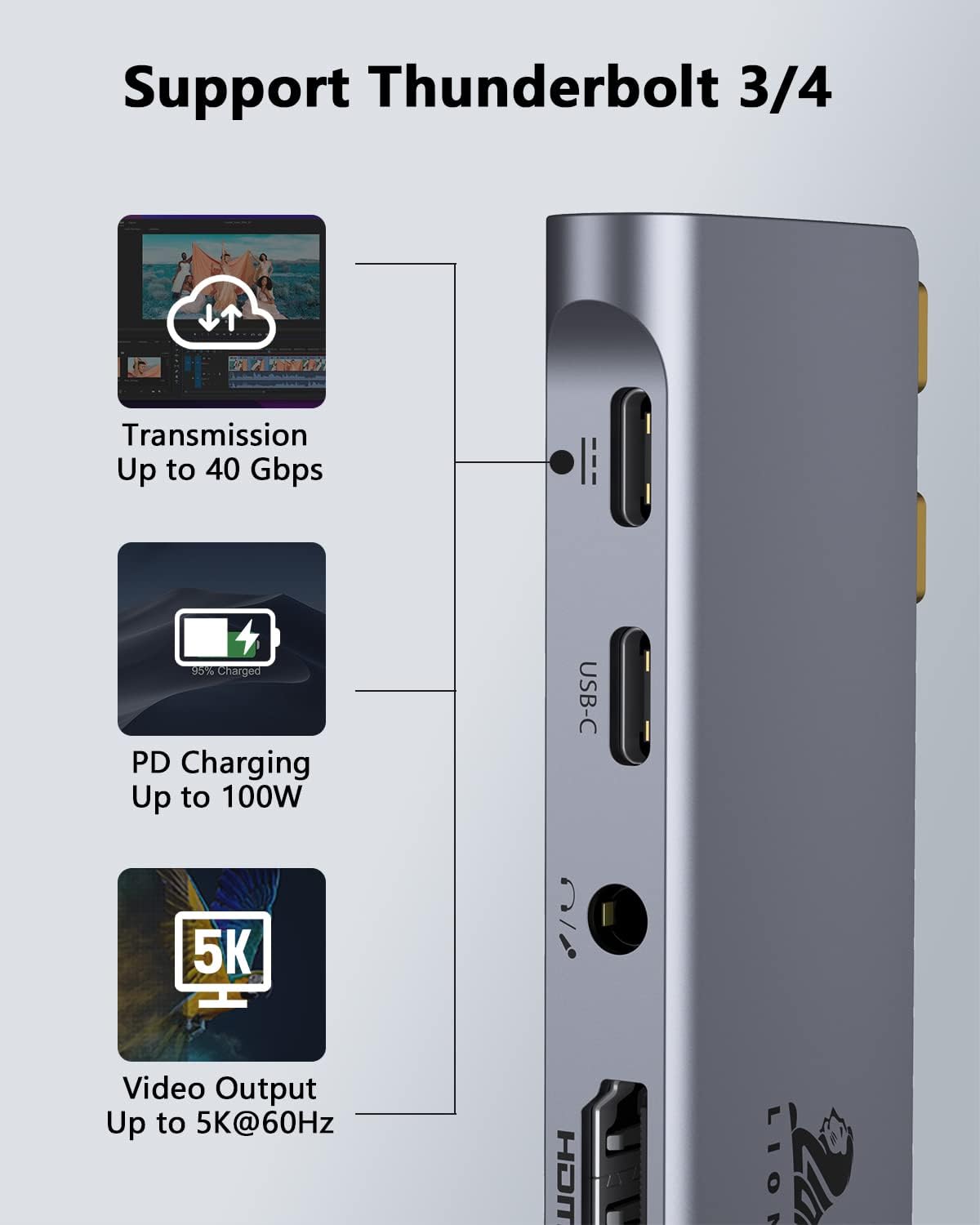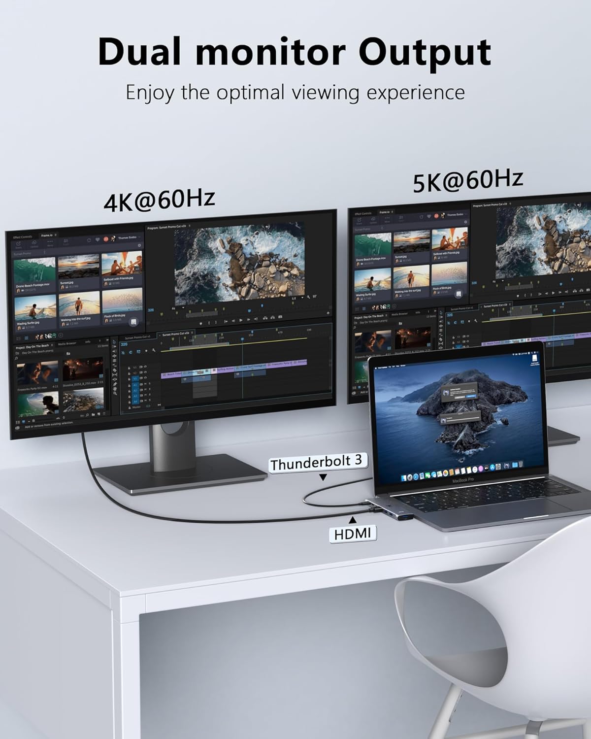 - 【A Multifunctional USB-C port compatible with Thunderbolt 3/4 】In this Macbook Pro dongle,one USB-C Port compatible with Thunderbolt 3/4 supports data transfer up to 40Gb/s, up to 5K displays, up to 100W power; It and HDMI port can be used simultaneously to support dual monitor display ,to mirror or extend your laptop's display to your TV, monitor or projector[Note: For M1M2M3 , this macbook accessories does not support dual display. Another usb c port is only for data transfer, speed usb 3.0 ]