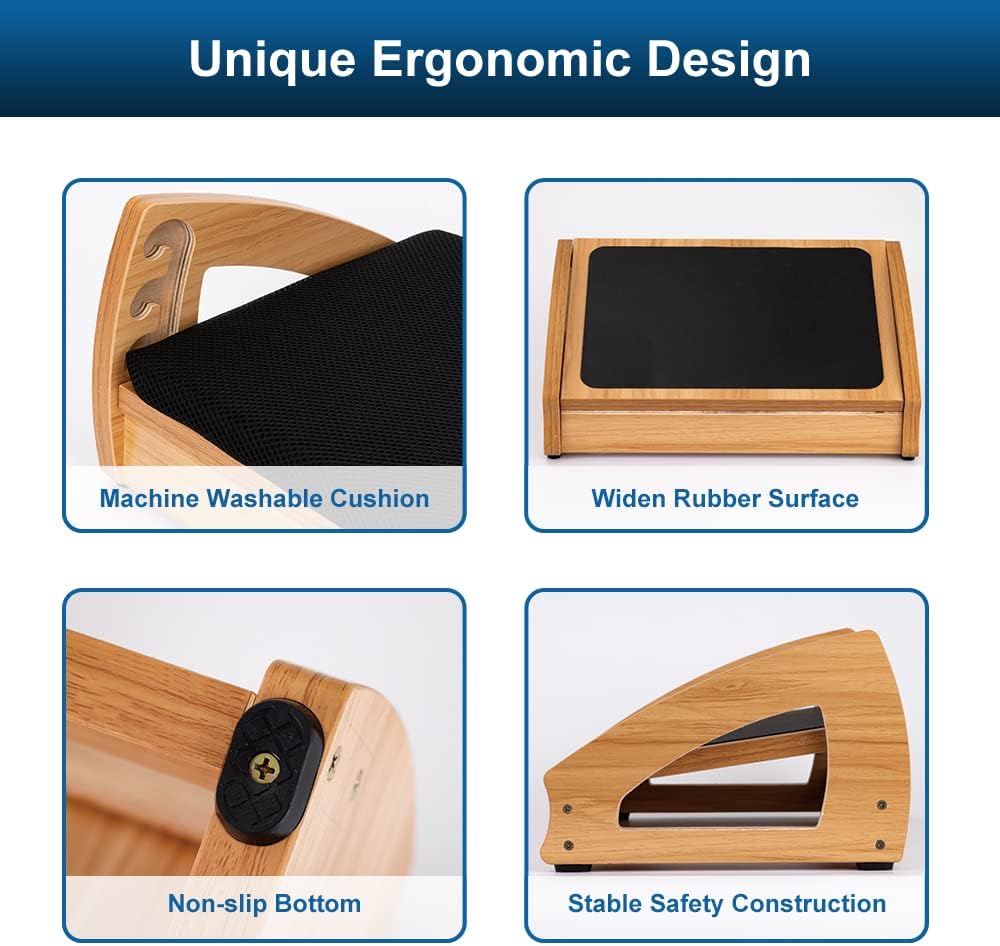 - Safe & Durable: Constructed from high-quality Lauan hardwood plywood sourced from plantation-grown timbers, this foot rest for under desk at work is sturdier and more durable than those made from ordinary plastic. Capable of supporting up to 400 lbs, each footrest comes with an anti-slip bottom to prevent slipping or sliding while rolling and tilting.