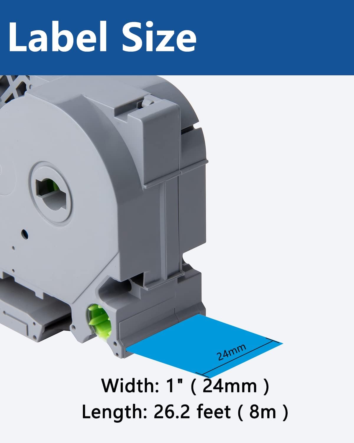 - Size - 0.94" width x 26.2' length ( 24mm x 8m ) each 24mm label maker tape. Color - Black ink on blue tape