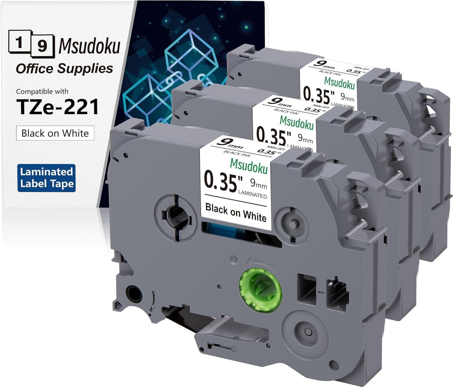 - These compatible for brother label maker tape 9mm 0.35 TZe-221 TZe221 have strong adhesive and no sticky residue when you remove it. The split back design of ptouch label tape 9mm white tape is very easy to peel off