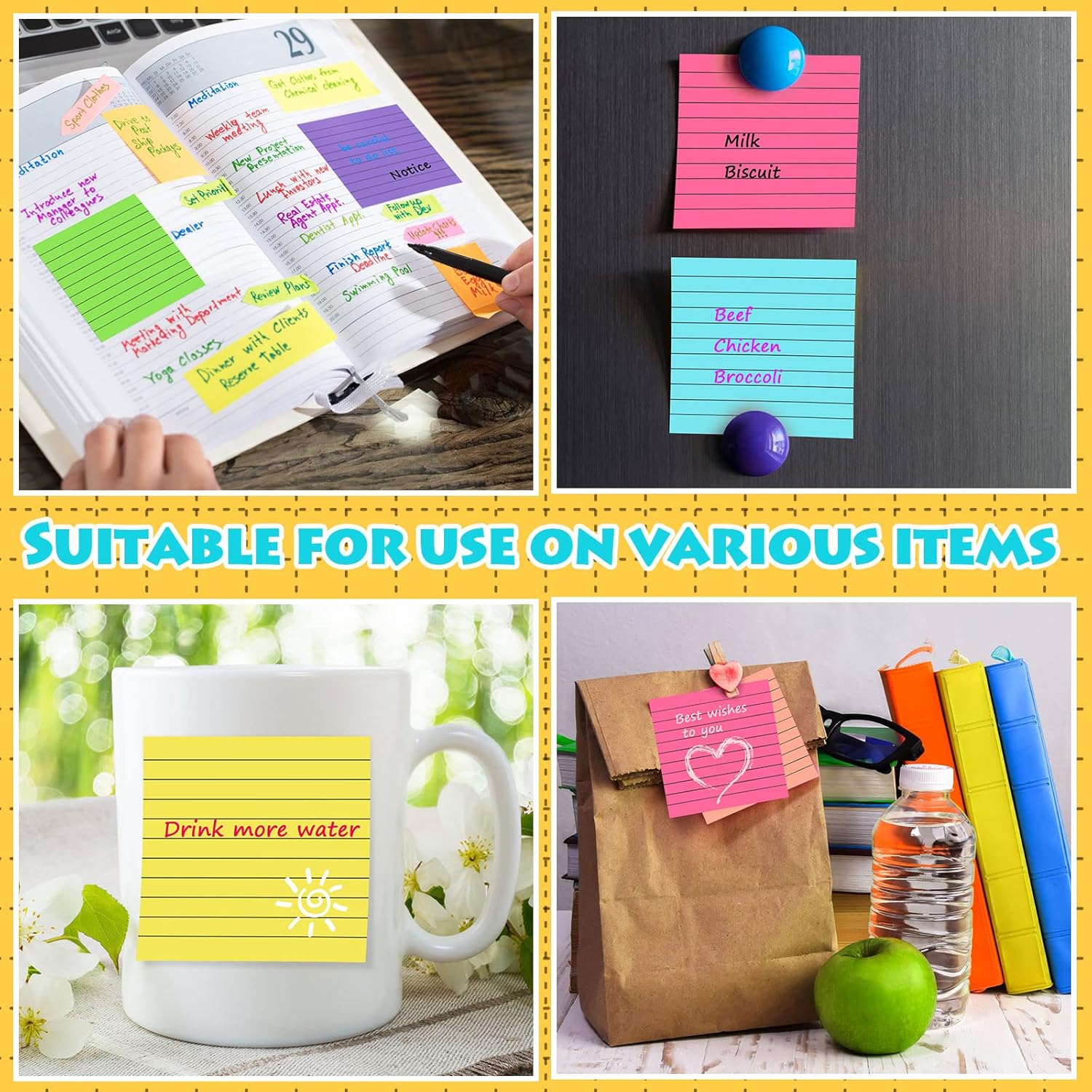 - Multiple Use: our lined self sticky notes are convenient for leaving notes or reminders on walls, doors, fridge, monitors, books, blackboards, or other surfaces, suitable for school, home and office use and wherever they are needed, effectively recording things to do and avoiding forgetting