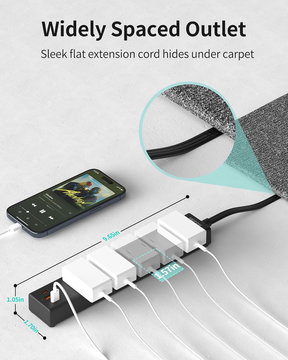 - [Extremely Thin Extension Cord]-The 10-foot flat cable is 50% thinner than the traditional power cords to run it under a rug or along walls without adding unsightly bulk or creating a trip hazard. It can keep unsightly cords hidden and allows furniture placement without having to accommodate them.