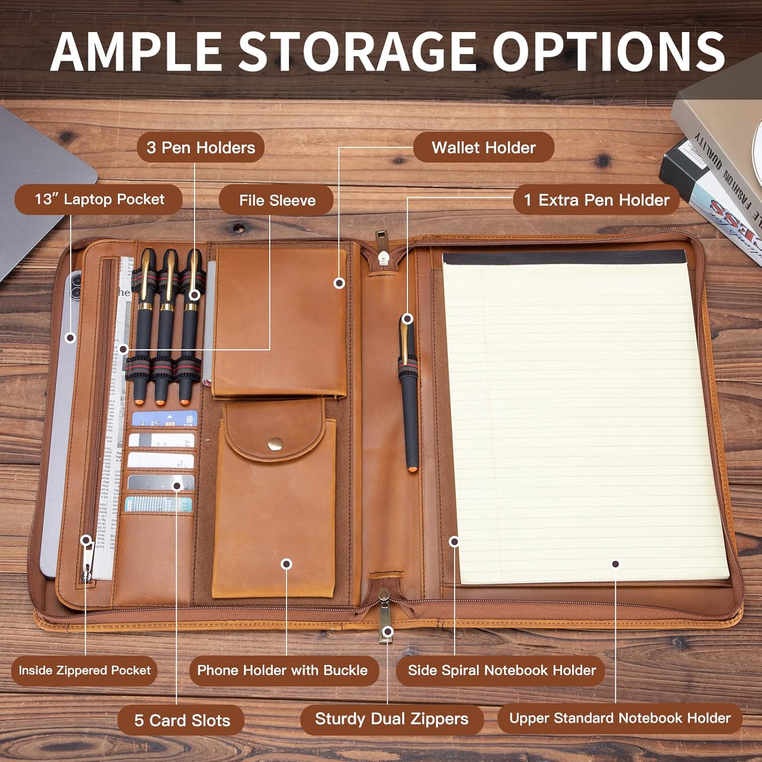 - Functional Storage: Side spiral notebook holder and upper standard notebook holder. Phone holder with buckle, wallet pocket, 4 pen holders, 5 card slots and inside zippered pocket. In addition to the exterior pocket, the inside 13” laptop pocket is large enough for a 13” laptop or 13.3” MacBook Pro (Not for 13.3” MacBook Air).