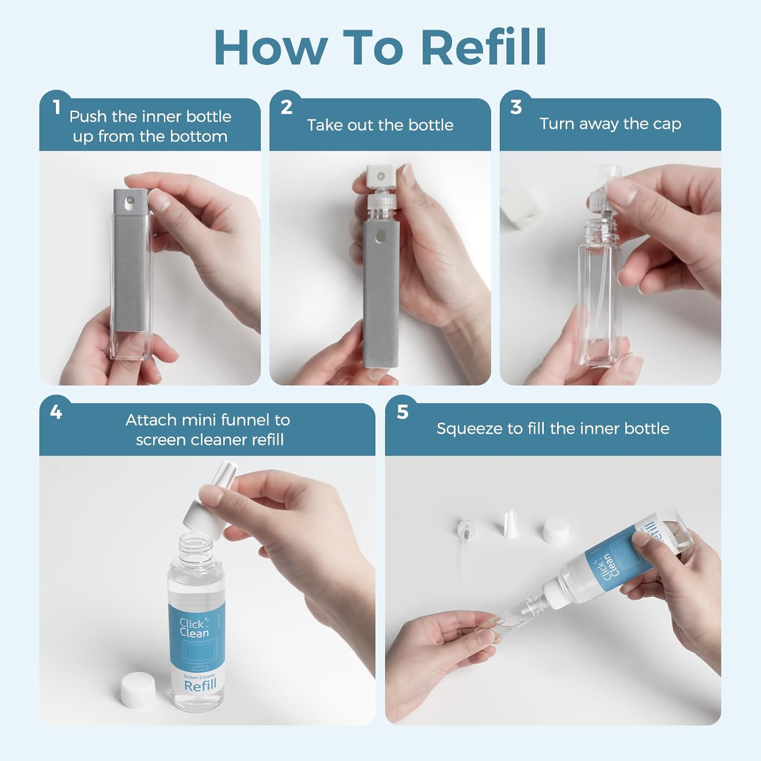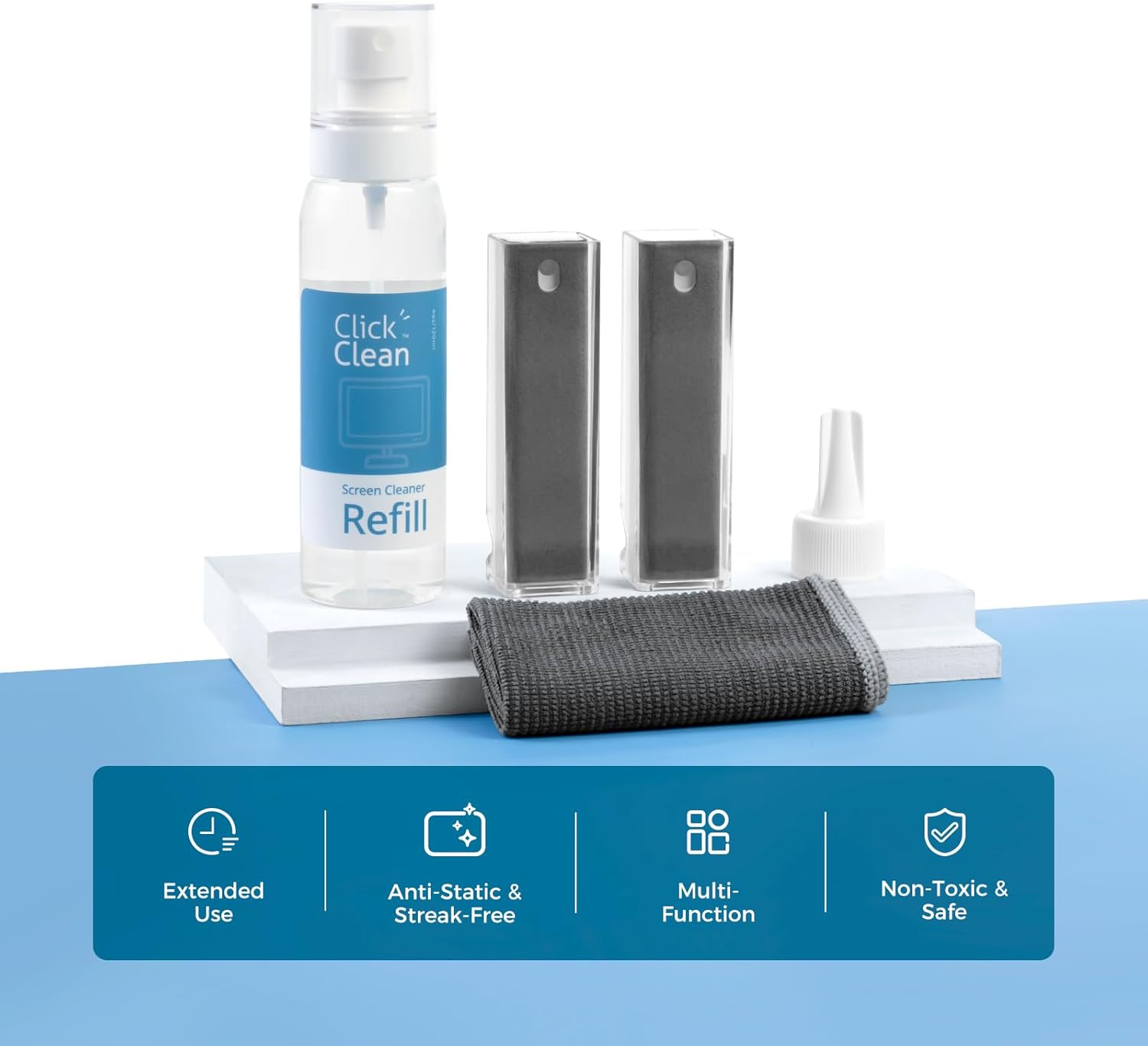 - ALL-IN-ONE MULTIFUNCTIONAL CLEANER KIT- In addition to the 2 screen cleaners included, you get one 4oz bottle of refill, 1 microfiber cloth, 1 mini funnel (built-in), and a sprayer. The refill extends the product's life; the mini funnel helps you refill the cleaner; the sprayer mounts to the refill spout, and the fibre cloth is a new product.