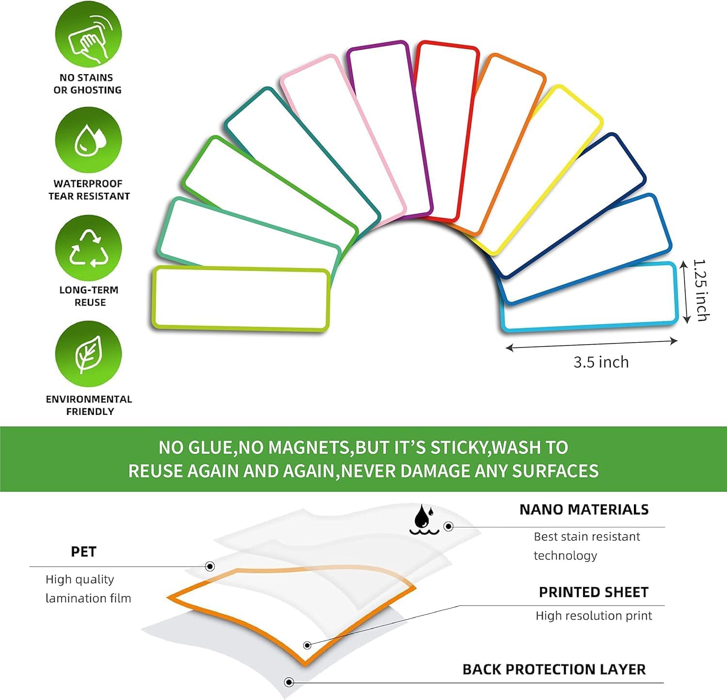 - 💖Reusable Dry Erase Labels: dry erase sticky labels are made of Freon-free Nano Material and dry erase film, smooth writing and wipe off easily, no wear in use and easy to clean, no glue, no magnetic but can stick well, heat resistant, microwave safe, just WASH to Renew if get dirt or stickless, really reuse again and again