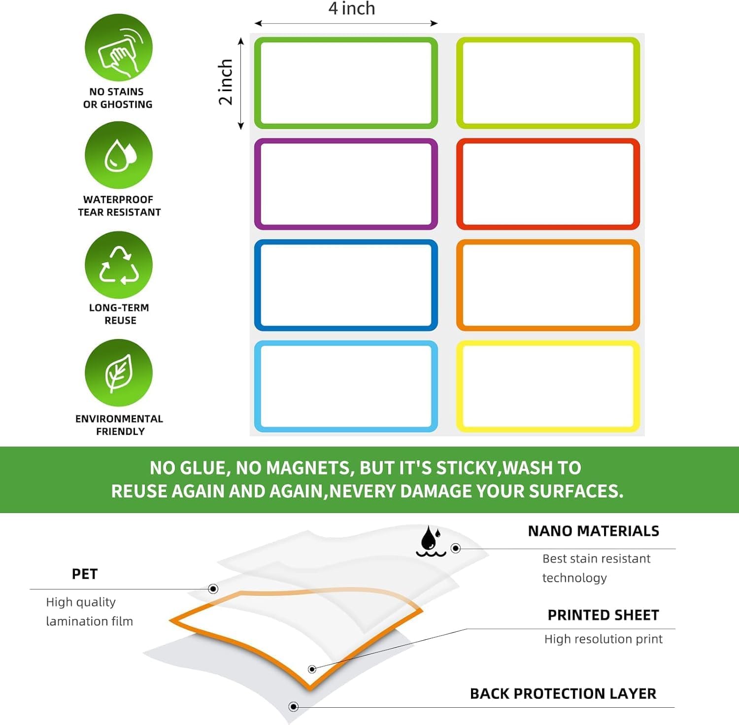 - 💖Reusable Dry Erase Labels: dry erase sticky labels are made of Freon-free Nano Material and dry erase film, smooth writing and wipe off easily, no wear in use and easy to clean, no glue, no magnetic but can stick well, heat resistant, microwave safe, just WASH to Renew if get dirt or stickless, really reuse again and again