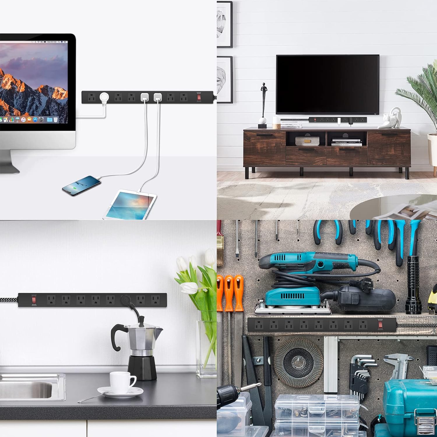 - 【8 in 1 Power Strip】This mountable power strip features 8 outlets and 1 switch, providing you with multiple options to connect your devices. With a 3 feet 14AWG braided cord, it ensures durability and easy reach to power sources. Rated at 1200J, 1875W, 15A, 125V, 60Hz, and with SGS certification, it guarantees safe and reliable charging.