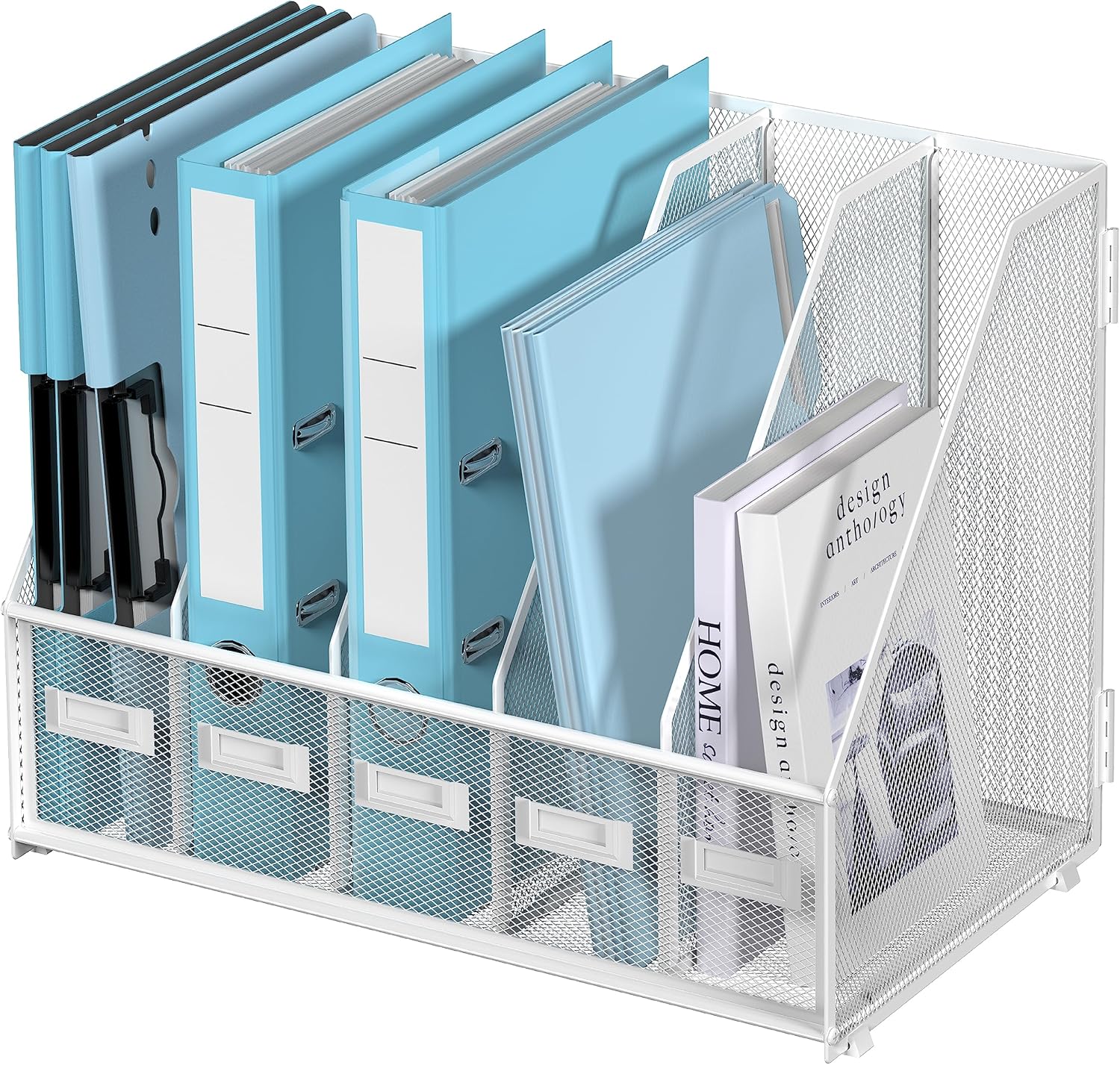 - [Humanized Detail Design] The folder holder has 5 vertical compartments, which is convenient for classifying office supplies. Replaceable tags are a great help for labeling, classifying, and quickly finding the desired item. Anti-skidding foot make the binder organizer difficult to slide on the desktop.