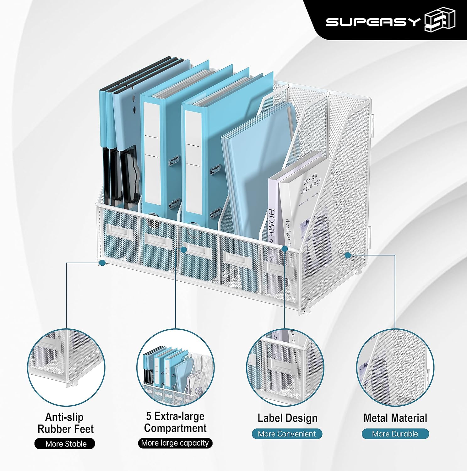 SUPEASY Desk Organizers Metal Desk Magazine File Holder with 5 Vertical Compartments Rack File Organizer for Office Desktop, Home Workspace, White Plus