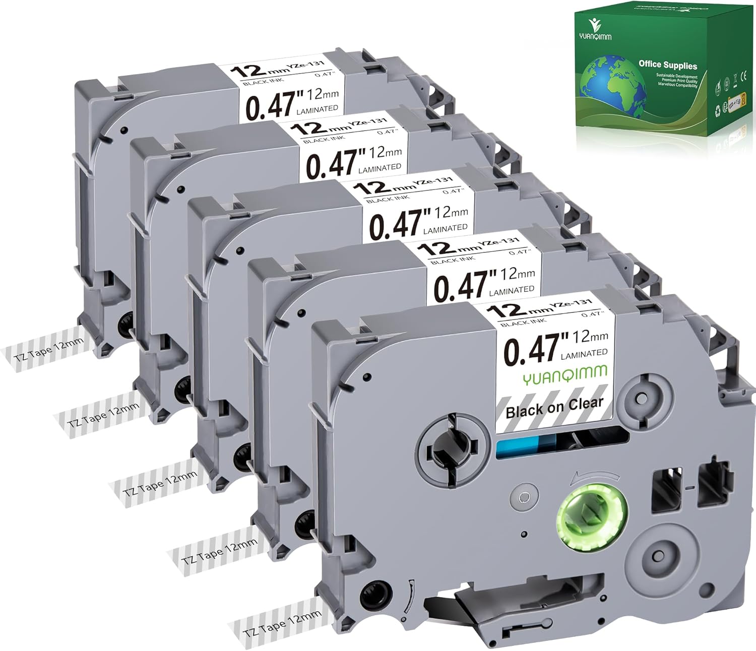 - 5-Pack compatible for Brother TZe-131 TZ131 TZe TZ tape 12mm 0.47 laminated clear tape replacement for Brother Ptouch label maker tape