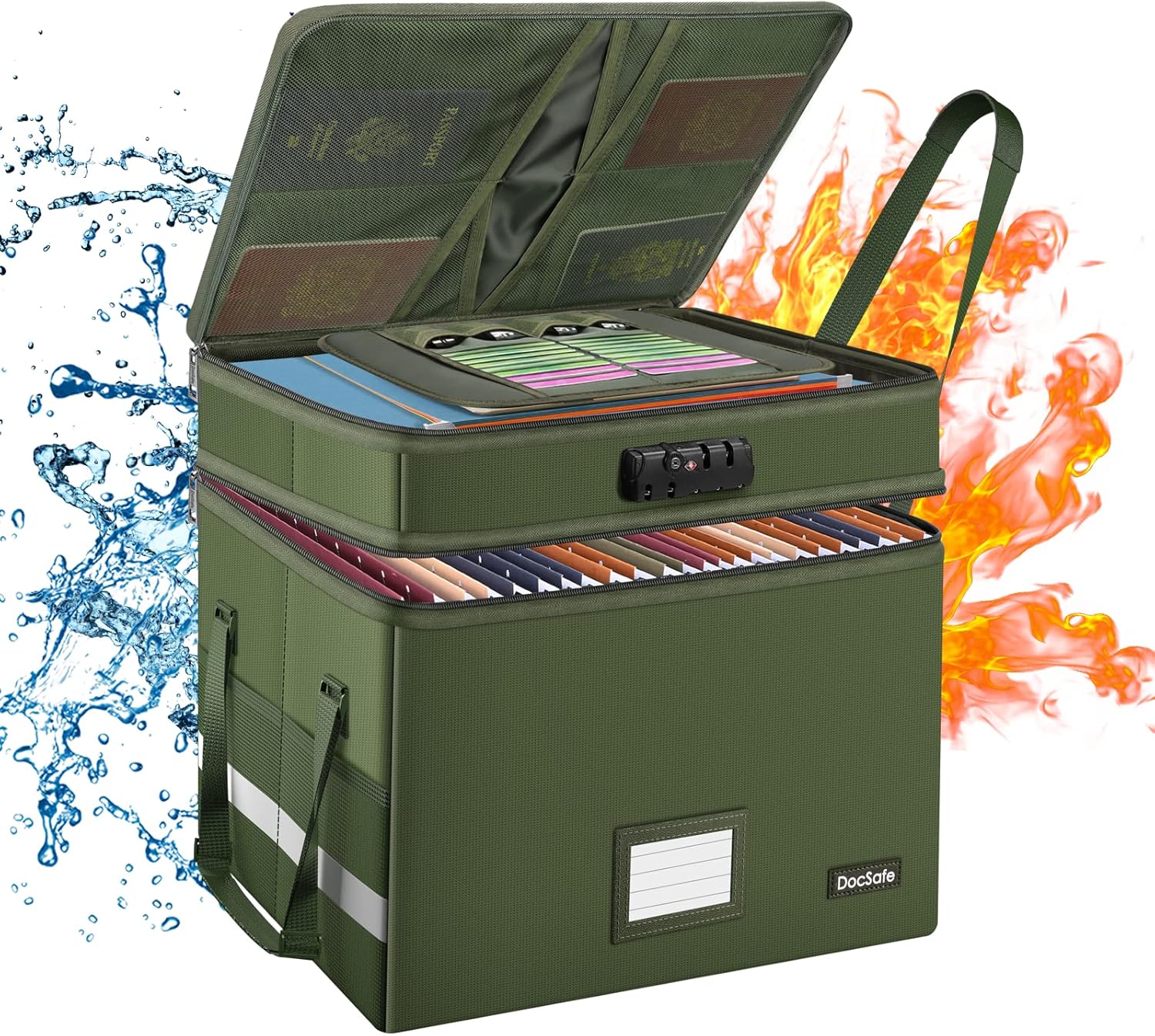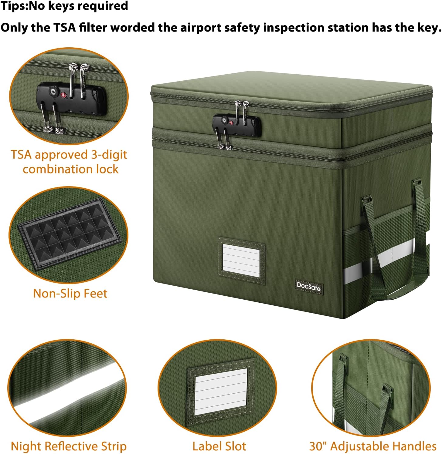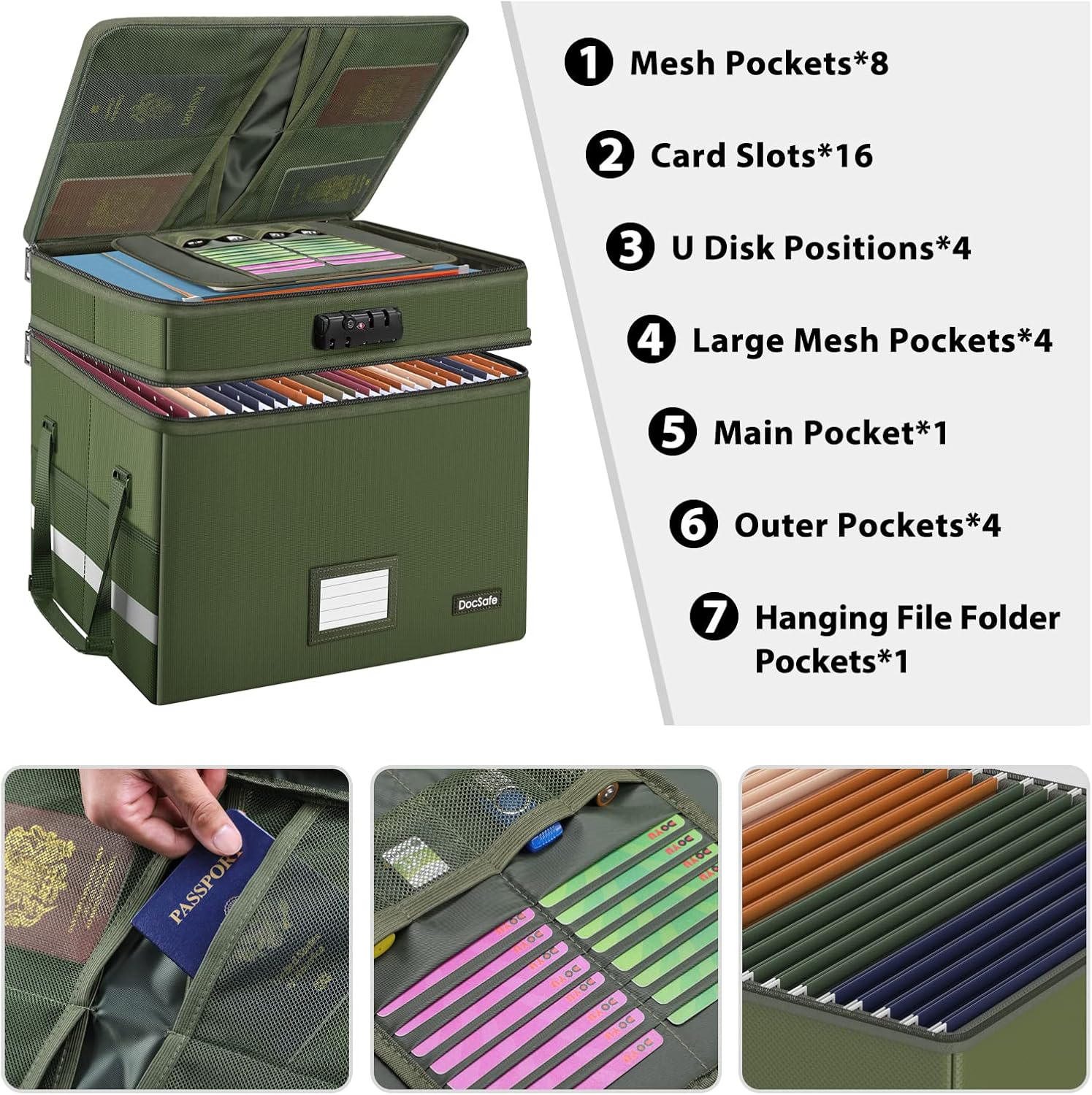 DocSafe File Box with Lock,Multi-Layer Fireproof Document Box Collapsible File Storage Organizer with Pockets/Handle,Portable Home Office Filing Cabinet for Hanging Letter/Legal Size Folders,Green