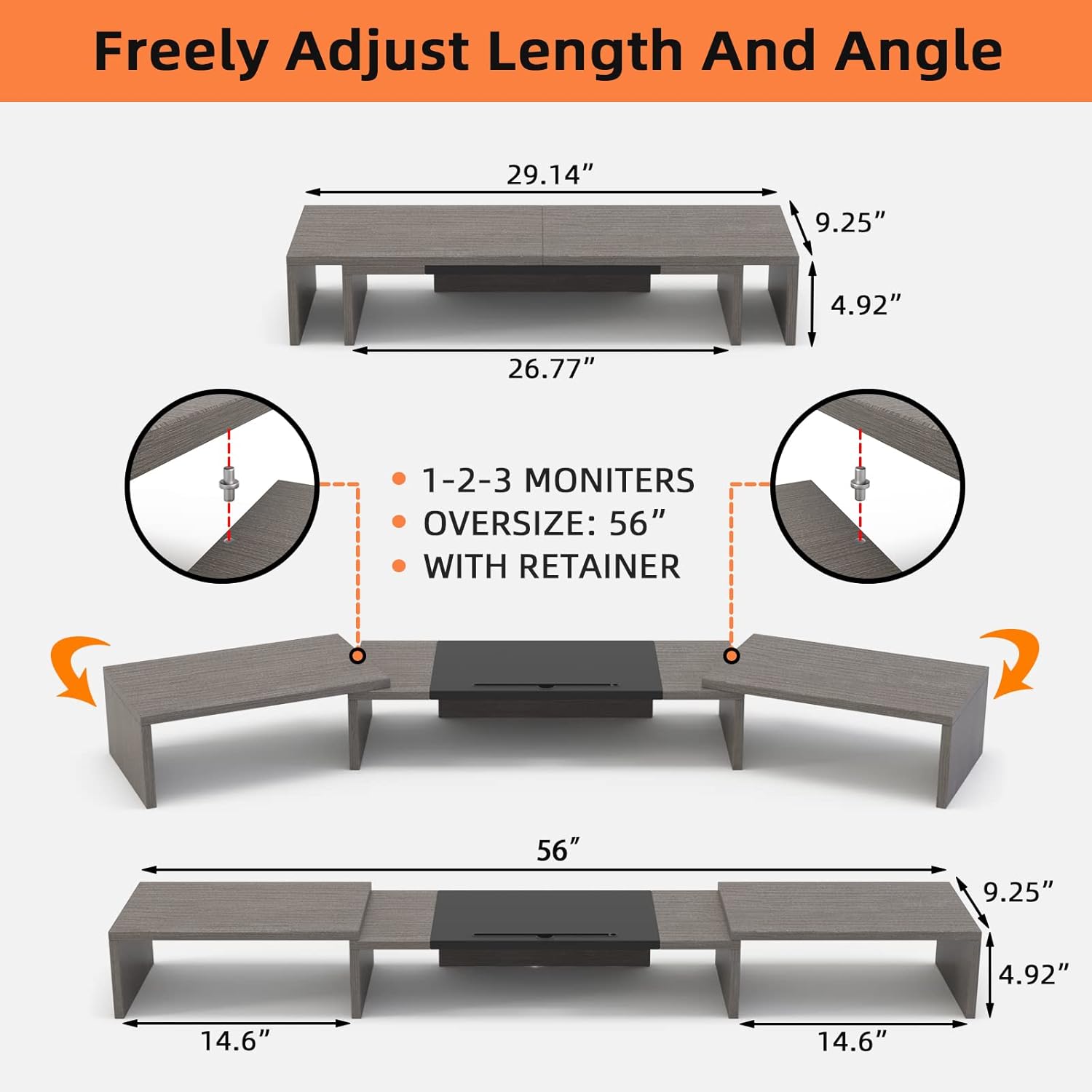 - ✅【 EXTRA LARGE FOR 1-2-3 MONITORS 】The size of monitor stand was improved to offer enough space for using 1-2-3 monitors together. The length of triple monitor stand can be changed from 29.14" to 50.6",Put together will help you organize and make your work more efficient!