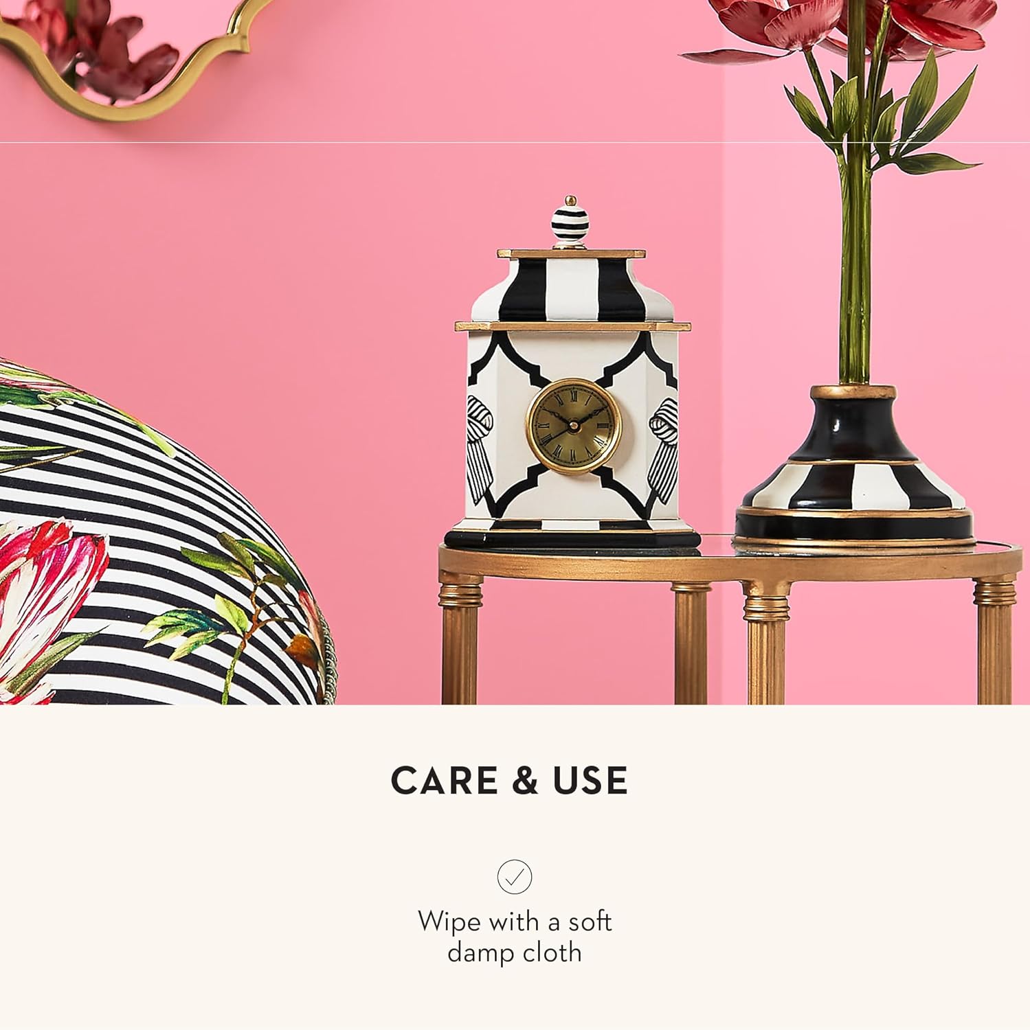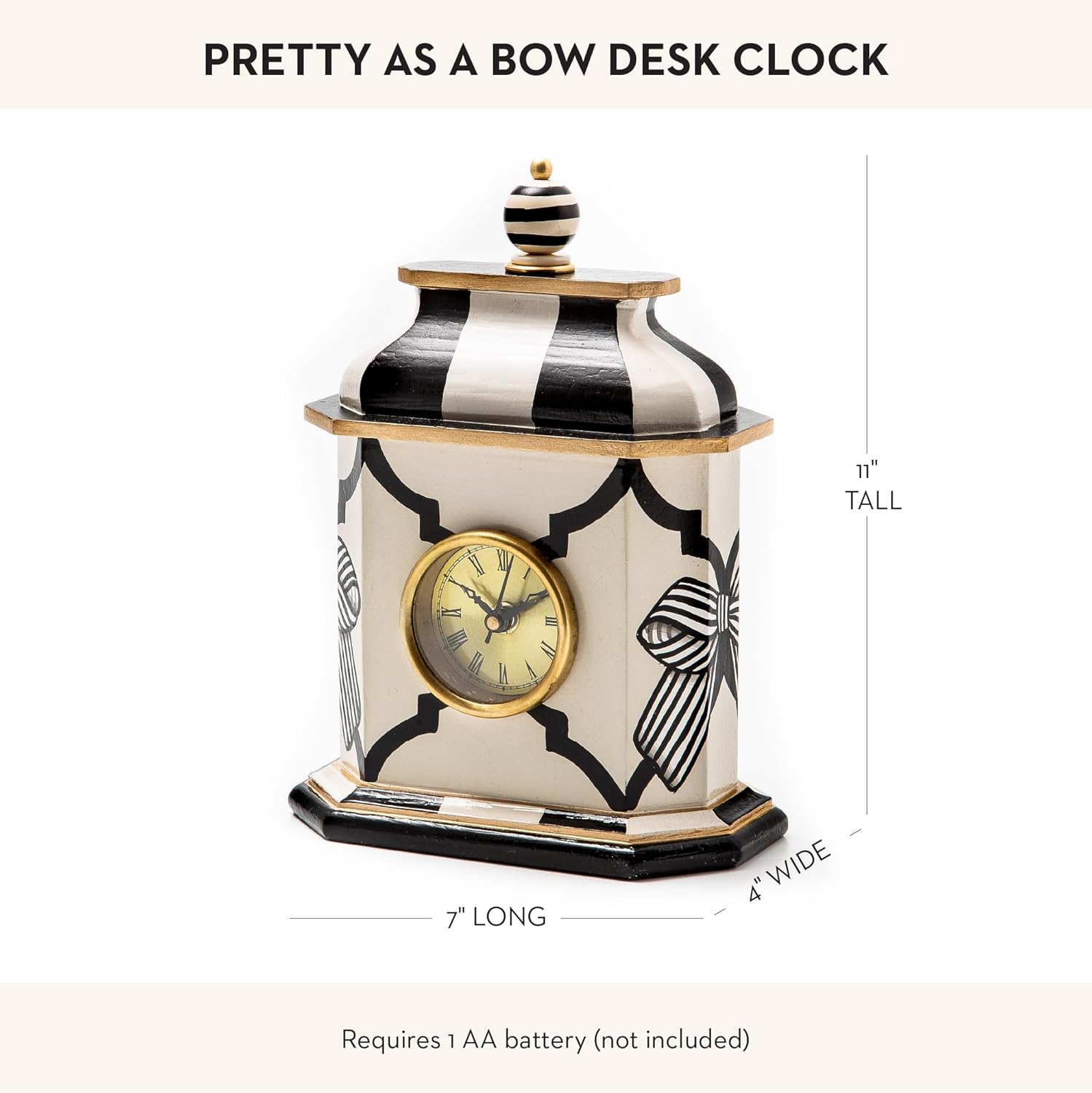 - ELEGANT HOME DECOR: Our Desk Clock is an elegant piece of clock decor that will make everyone watch the time. This fancy standing clock features hand-painted wood, brass accents, and our Pretty as a Bow pattern and is topped with a striped finial.