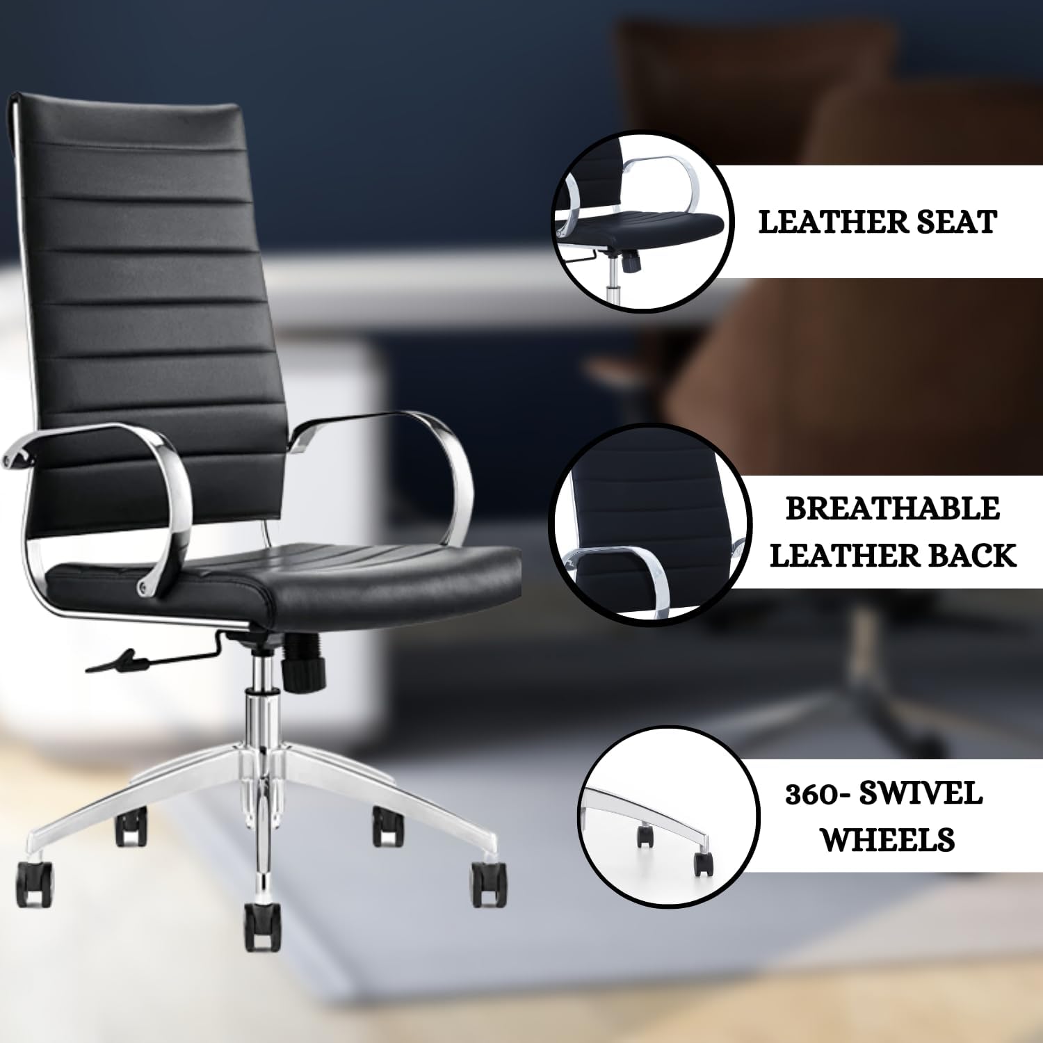 - ✅𝐄𝐫𝐠𝐨𝐧𝐨𝐦𝐢𝐜 𝐝𝐞𝐬𝐢𝐠𝐧: Ergonomic design in executive office chairs is crucial for enhancing comfort, reducing strain. The seat height of an ergonomic chair is adjustable, allowing users to position their feet flat on the floor, with knees at a 90-degree angle, promoting proper blood circulation. Moreover, an ergonomic chair should have a reclining function to enable users to change postures throughout the day. Investing in an ergonomic executive office chair enhances productivity, as users experience less fatigue and discomfort, enabling them to focus better on their tasks.