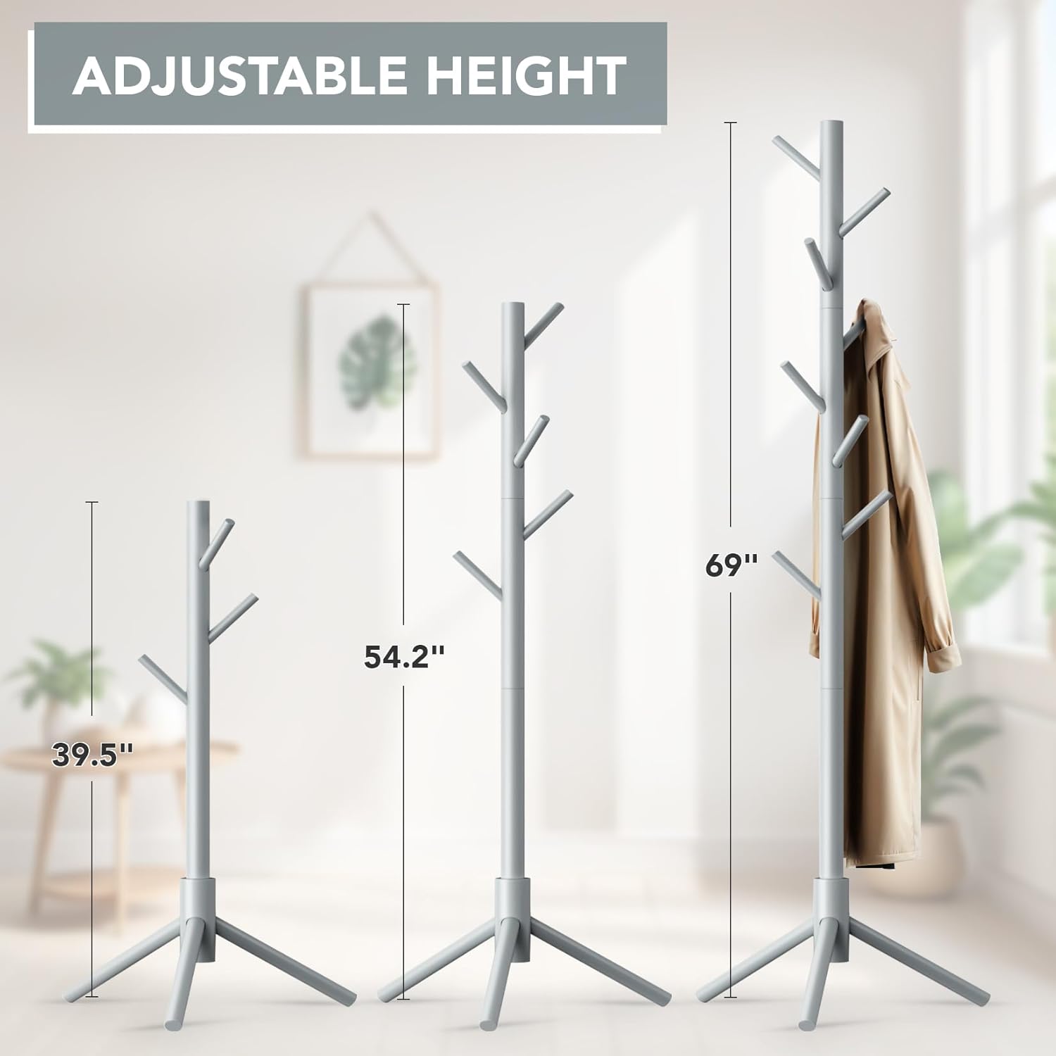 Wooden Tree Coat Rack Stand,Sturdy Freestanding Coat Rack with 8 Hooks,3 Adjustable Height for Child Adult,Wood Coat Stand Tree Fits Entryway Bedroom Office for Bags,Hats