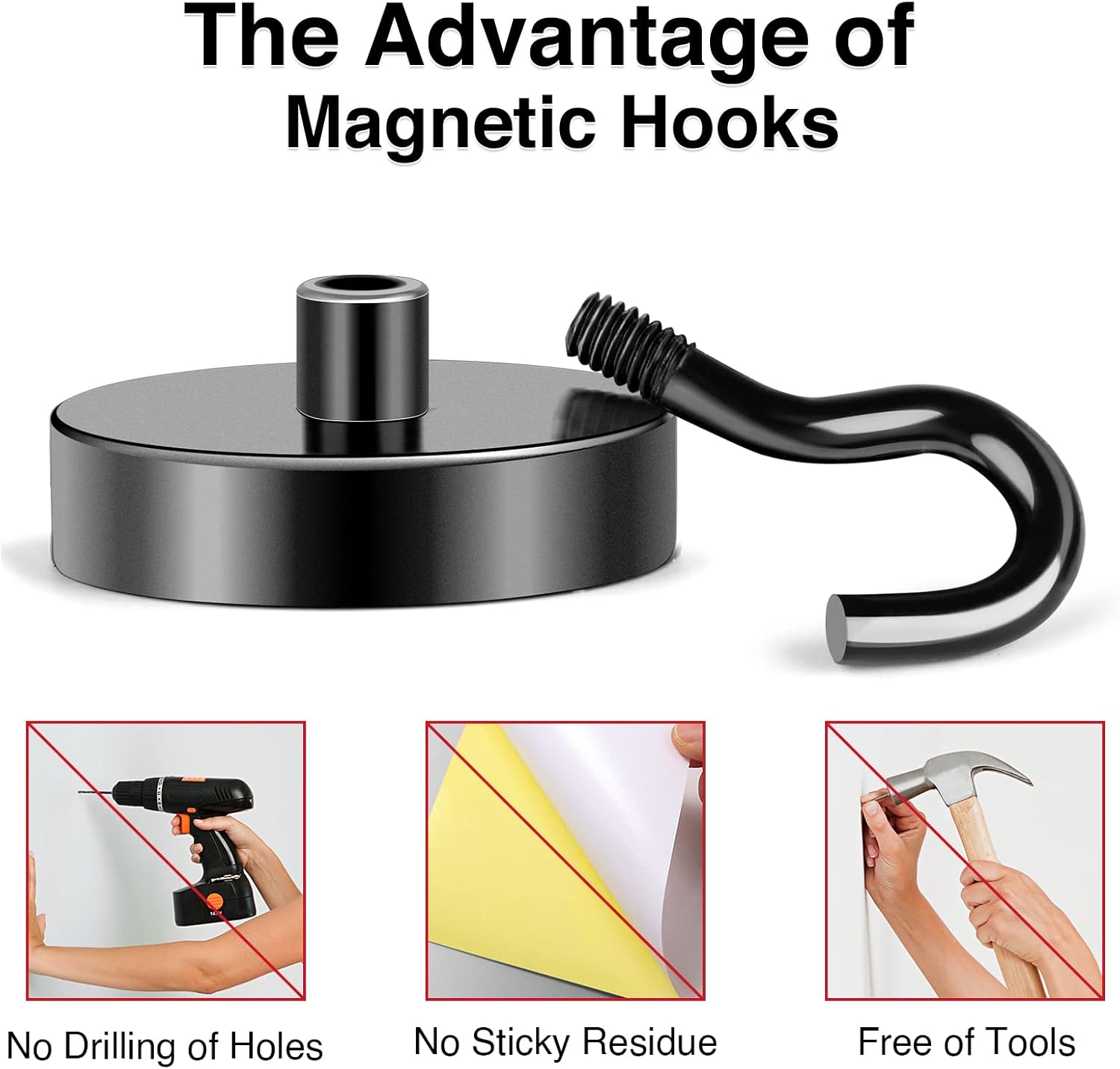 - 【Powerful Magnet with Hooks】- The black magnetic hooks are made of neodymium magnet, the powerful magnetic force is only concentrated at the bottom of the hooks, which can offer nearly 80lbs pulling force on horizontal application and the power reduced by 2/3 in the vertical direction.