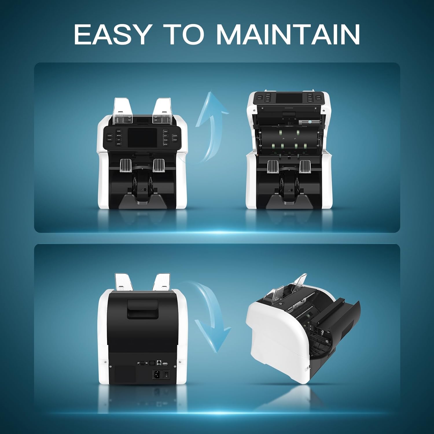 - Revolutionary Design: The most compact two pockets money sorter in the market, the passage can be fully opened from front(press the button under the panel), easy to make daily clean and remove foreign objects. Occupy a little bigger footprint than a normal bill counter, save working space