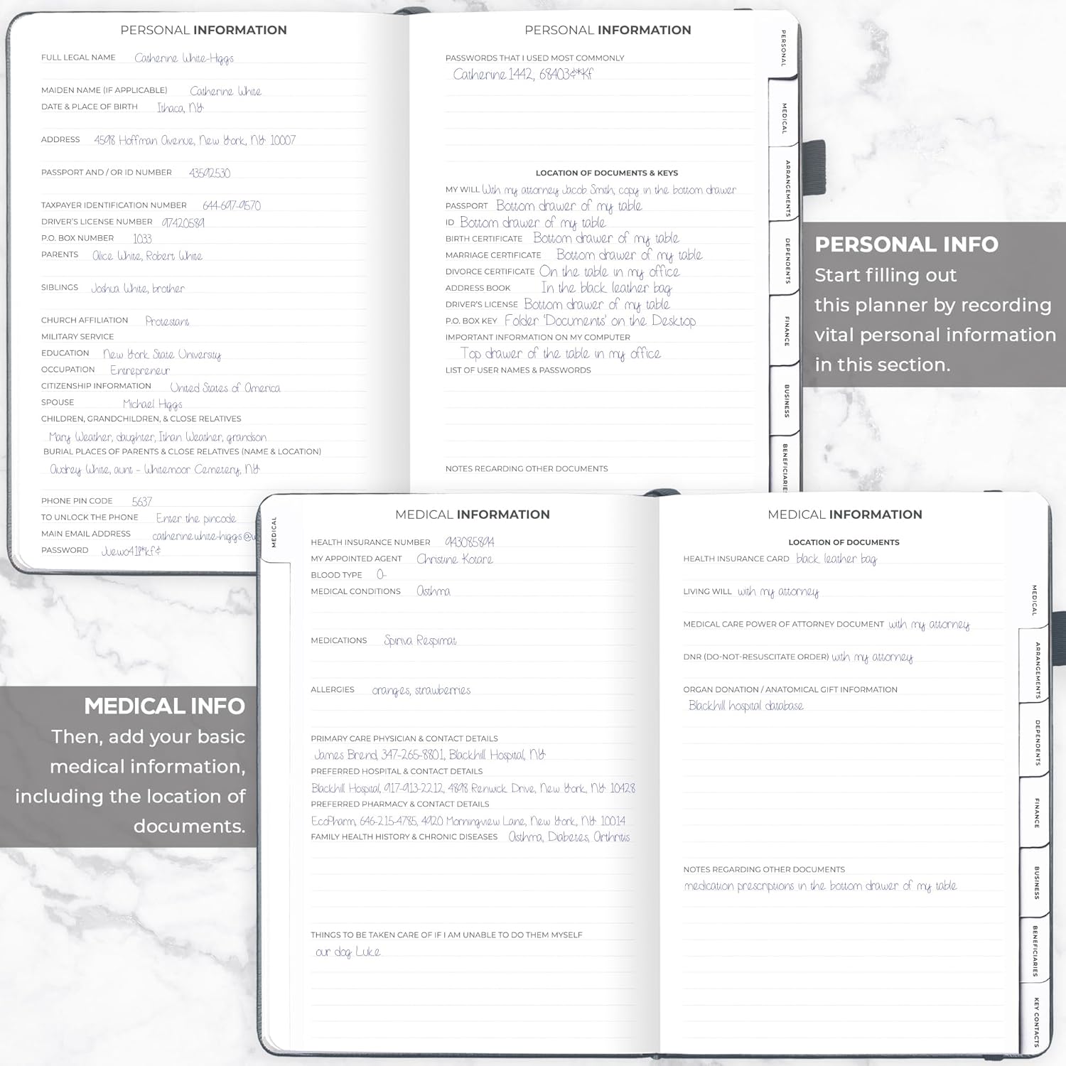 - MEDICAL & FINANCIAL INFO, INSURANCE POLICIES, ACTIVE MEMBERSHIPS & MORE: Inside this funeral planning workbook, you can add care instructions for dependents and pets, personal property, finance & business info, insurance policies, beneficiaries, and more.