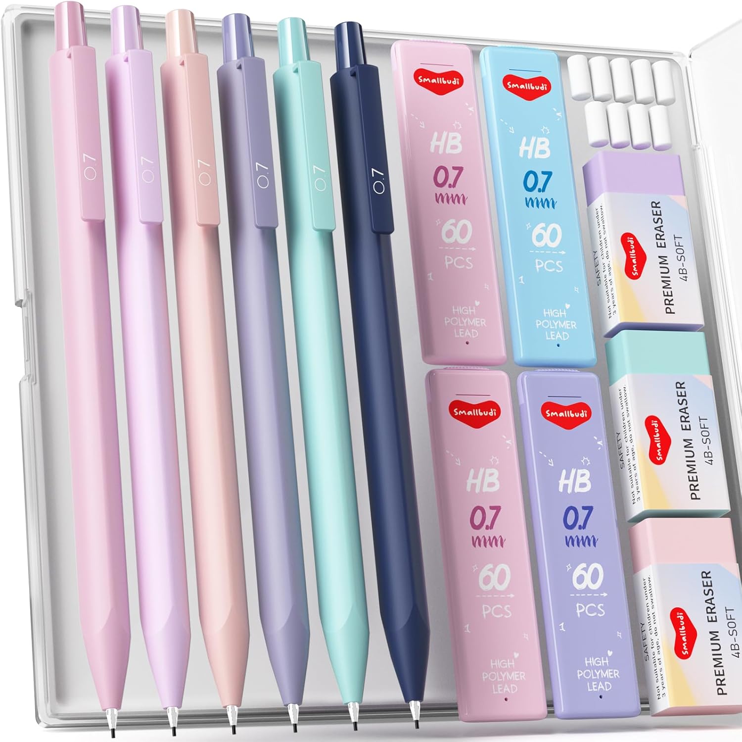 6PCS 0.7mm Mechanical Pencils Set with Case, Cute Pastel Mechanical Pencil with 240PCS HB Lead Refills, 3 Erasers, Aesthetic Back to School Supplies for Student Writing Drawing Sketching