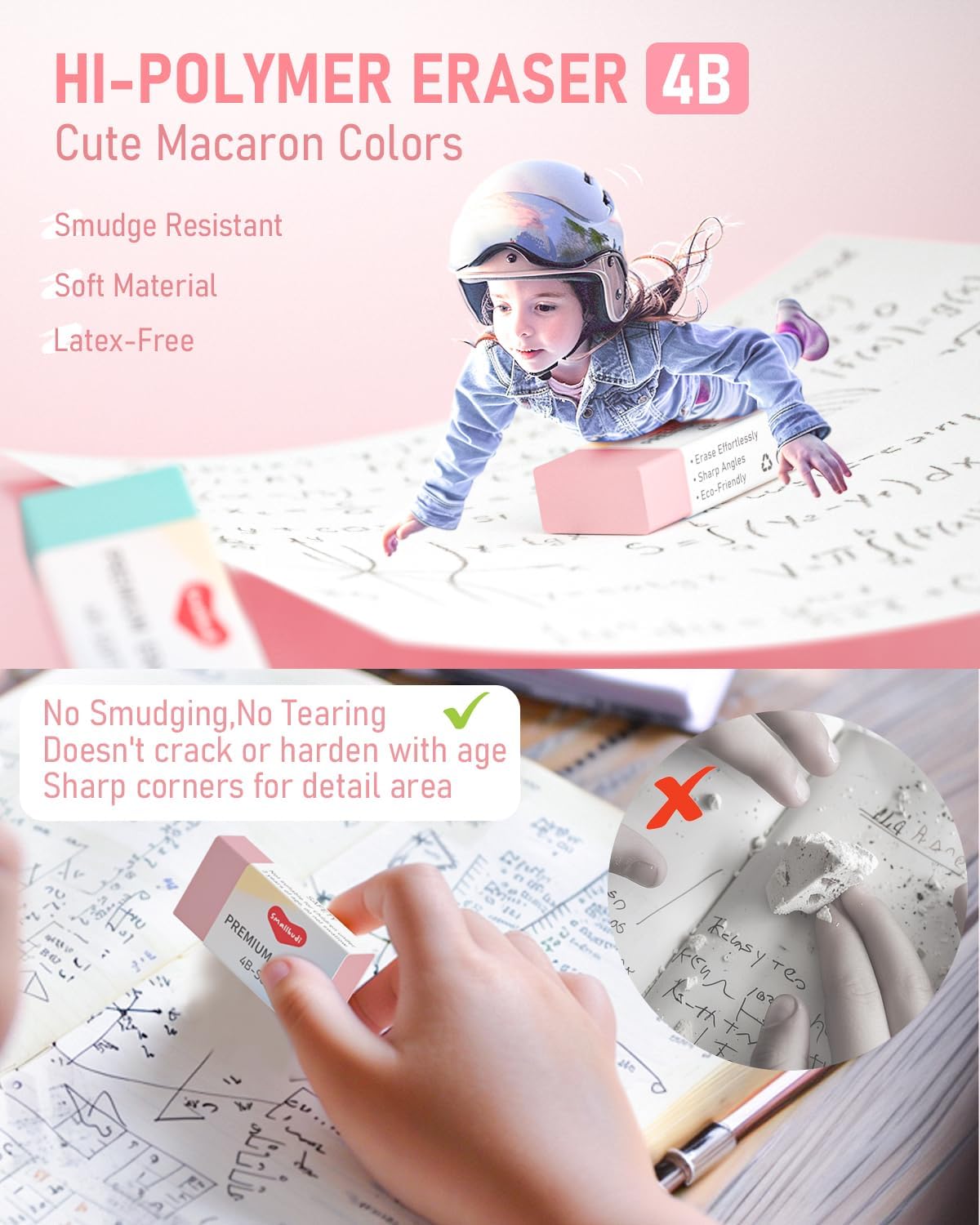 - Soft Latex-Free Erasers - Includes 3 pastel 4B erasers that erase cleanly without smudging or tearing paper, safe for all ages. The 9 small eraser refills ensure you're never without a backup for precise corrections