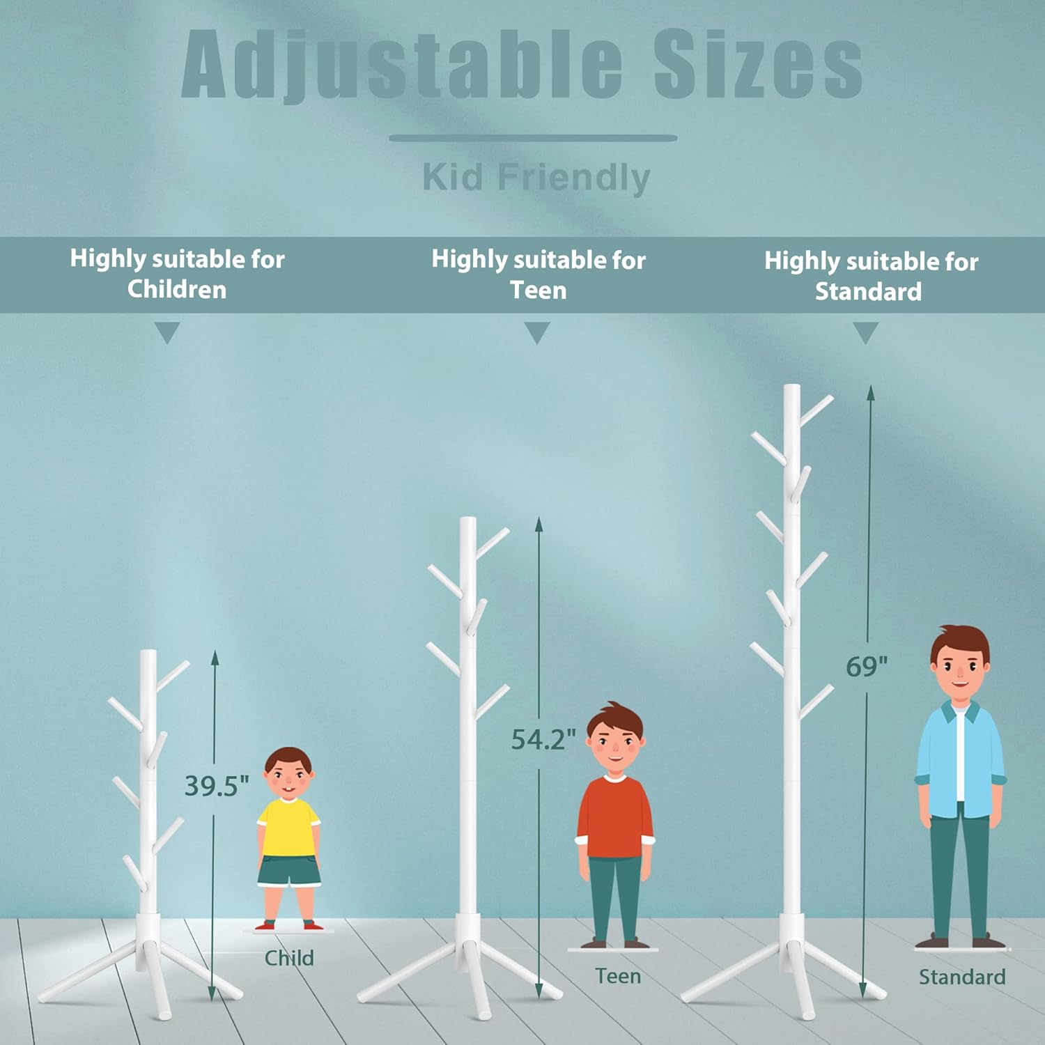 Haddockway Wooden Coat Rack Stand with 8 Hooks New Zealand Pine 3 Adjustable Coat Standing Tree Easy Assembly for Coats, Hats, Scarves and Handbags for Entryway, Hallway, Bedroom, Office,2 PCS