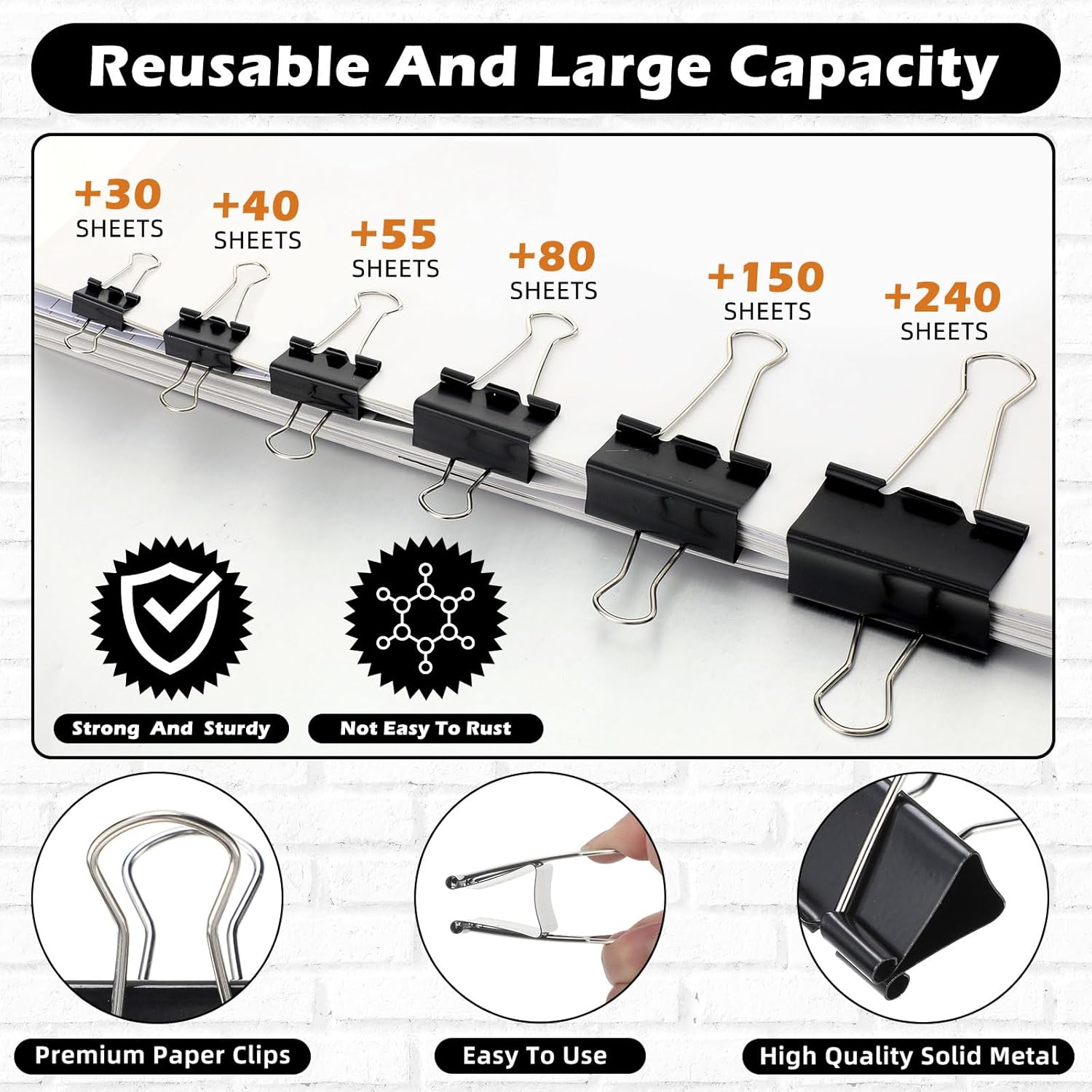 Yexiya 640 Pcs Binder Clips Paper Clamps Assorted Sizes Black, Metal Paper Binder Clips Combination Black Binding Paperwork Clamp Bulk 6 Sizes with Box School Teachers Office Supplies