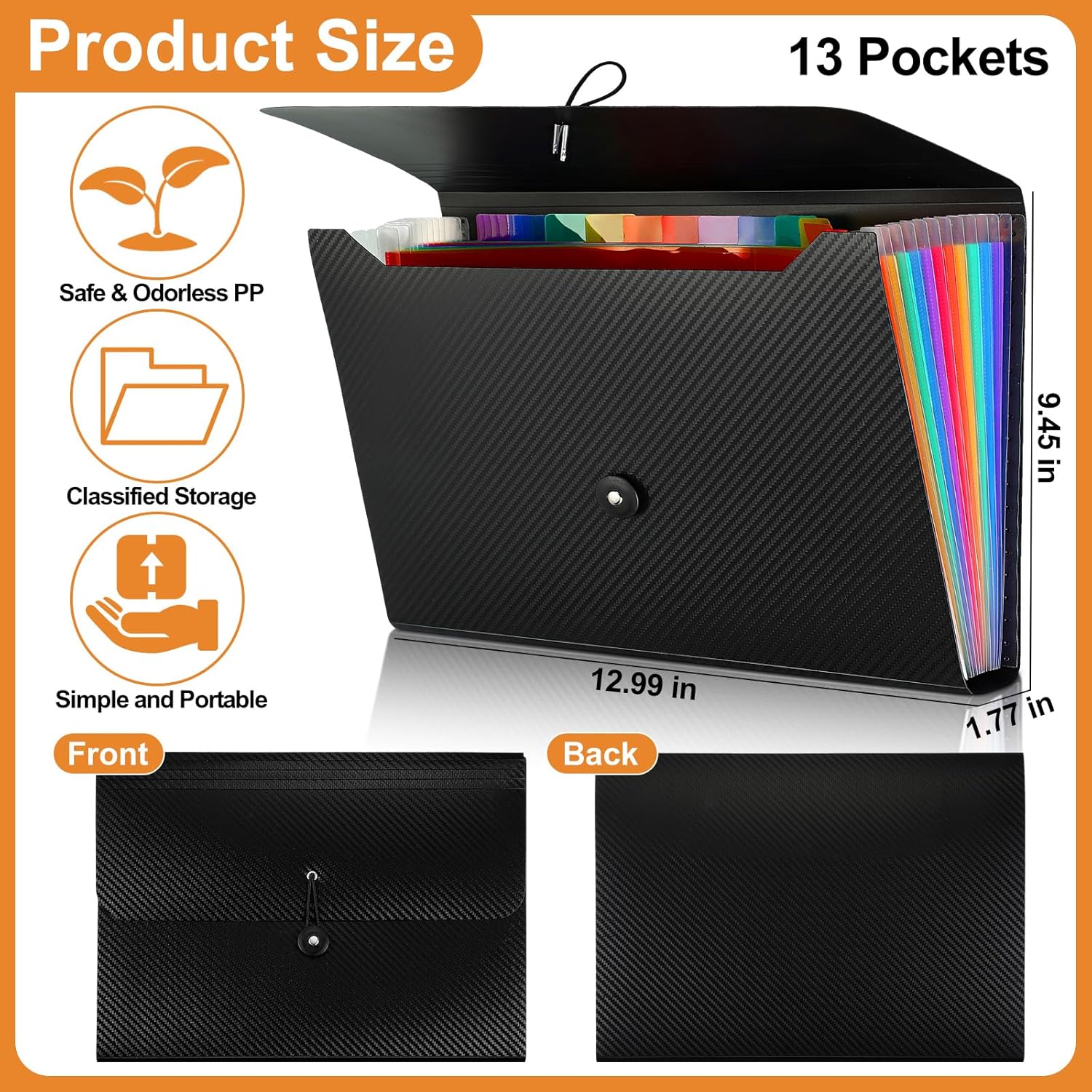 - What You Get: you will receive 6 pieces of file folder organizers with 13 pockets, 6 sheets of label stickers, 18 pieces for each sheet; File folder measures about 12.99 x 9.45 x 1.77 inches; These expanding file folders are large enough to keep your important documents securely, help to classify and find your files effectively