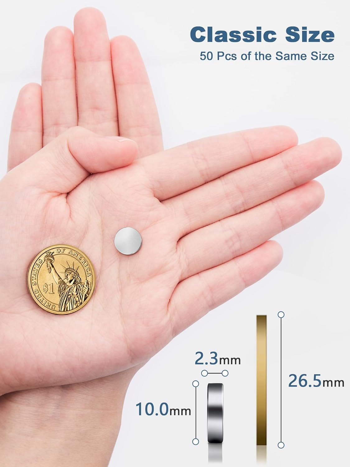 - Useful Design - 50 Pcs of same size (Diameter: 10mm, thickness: 2.3mm), each magnet is able to hold at least 15pcs sticky notes. You don't have to worry it's not able to fixate the paper.