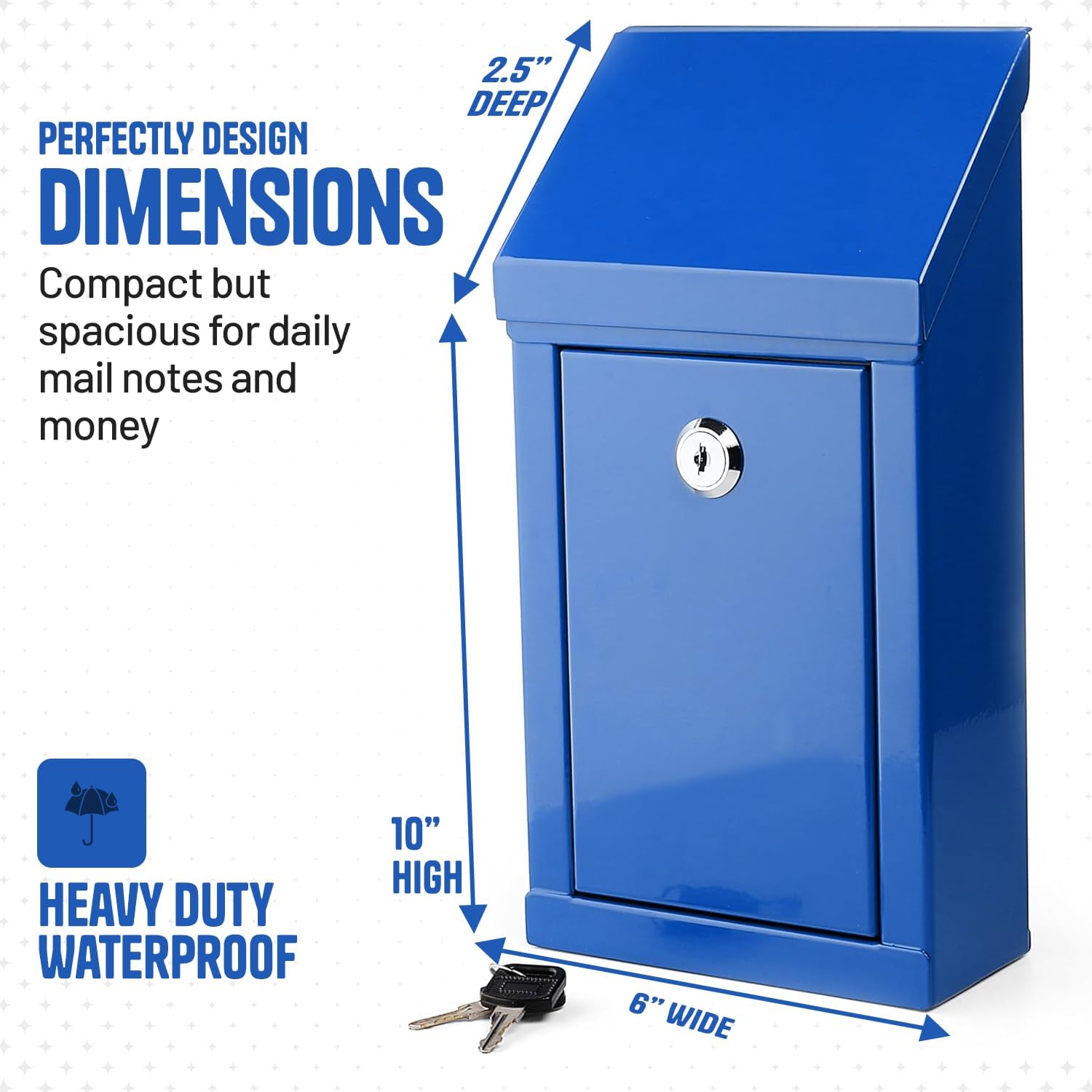 Metal Donation Box-Suggestion Box with Slot and lock-Cash Lock box for Money-Waterproof Drop Box-Comment and ballot voting box-comes with pre-drilled holes for easy wall mounting 10 X 6 X 2.5"(Blue)