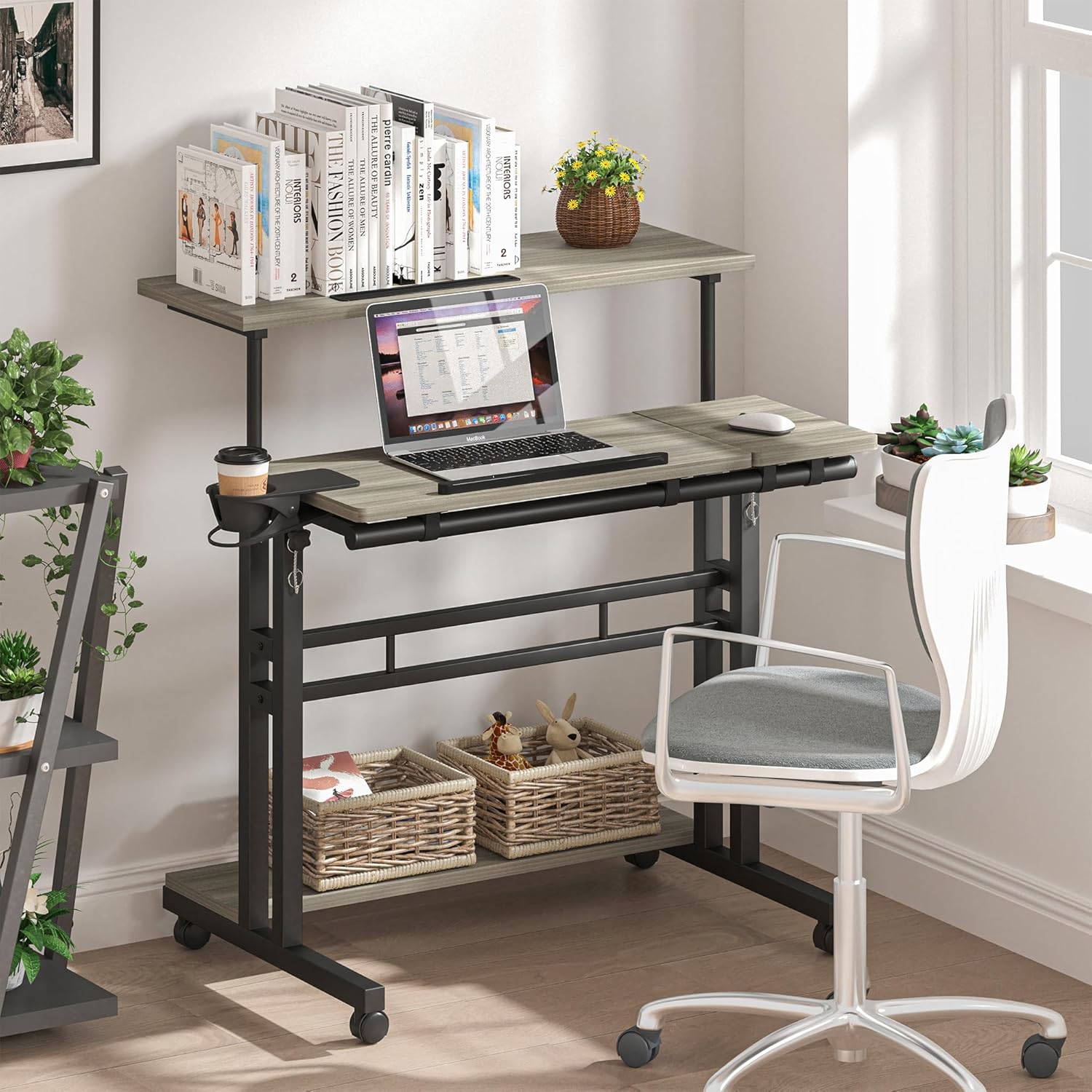 Mobile Standing Desk, Adjustable Rolling Computer Desk with 3 Desktops, Portable Laptop Table with Cup Holder, Home Office Laptop Workstation on Lockable Wheels, Grey Oak