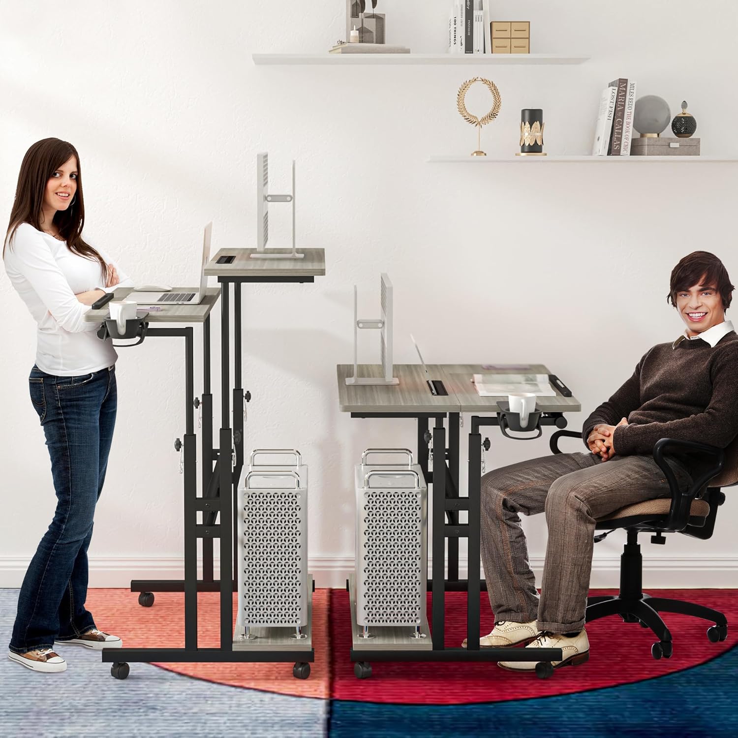 - Standing and Sitting 2 Modes: Mobile stand up desk height can be adjusted from 26.9 to 46.8 inches as you wish; Changing between sitting and standing avoids health problems of a long time sitting; Rolling table has a desk cup holder and 2 L shaped hooks