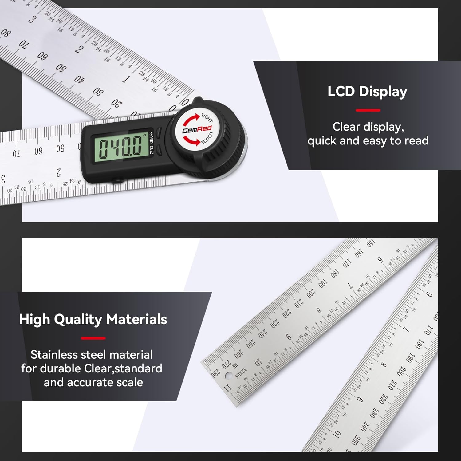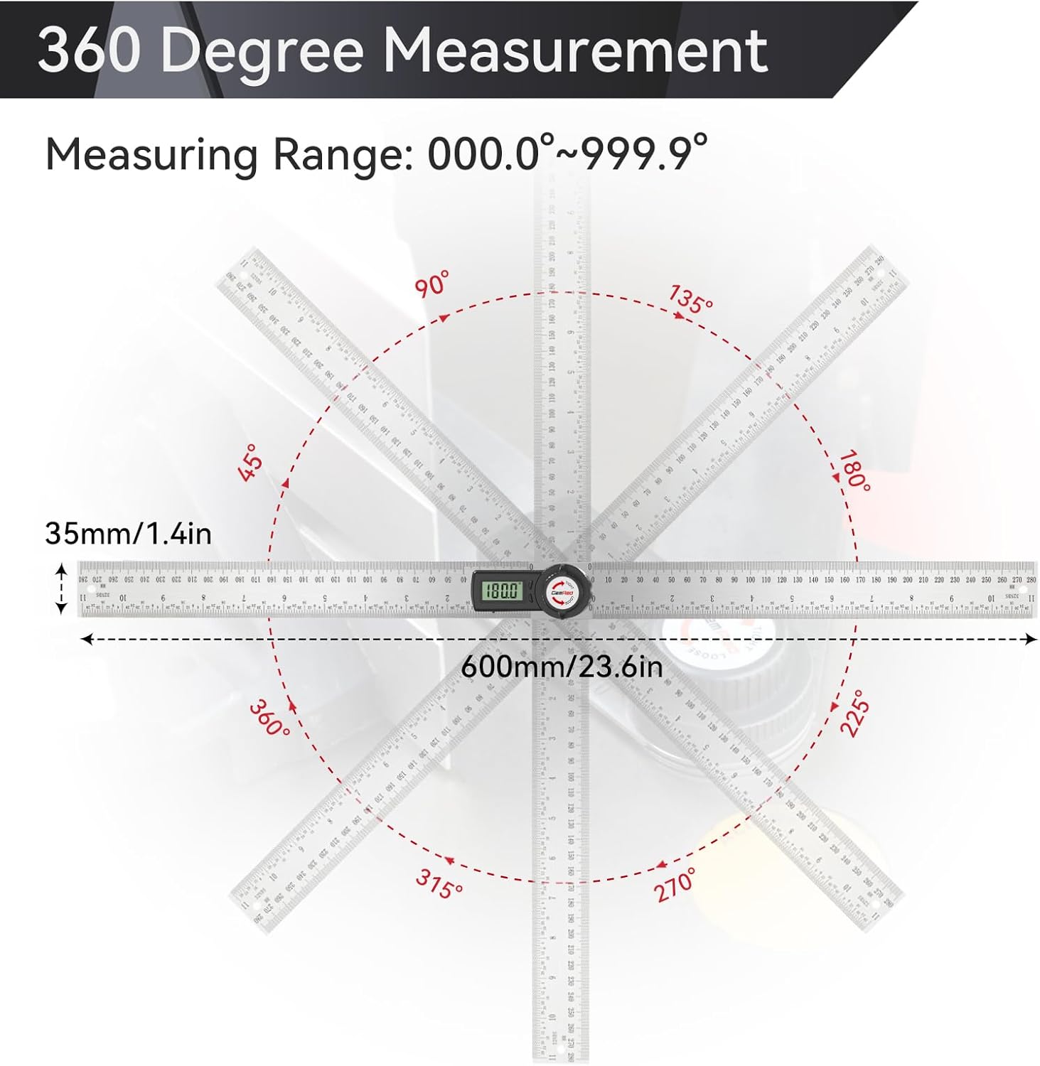 - Patented measuring technology】Ruler and protractor combination for easy measuring inside and outside angles. 【Digital Display】Easy to read.