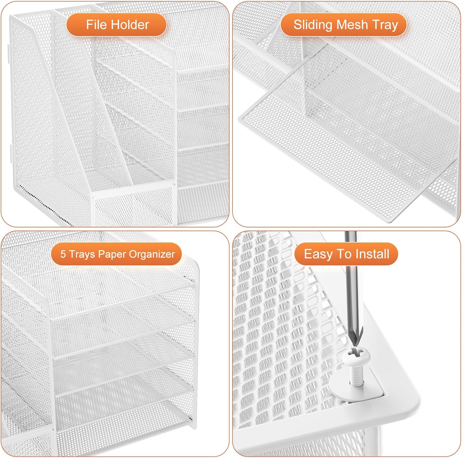 Marbrasse Desk Organizer with File Holder, 5-Tier Paper Letter Tray, Mesh Desk Organizers and Accessories with Magazine Holder, Desktop Organizer and Storage for Office Supplies (White)