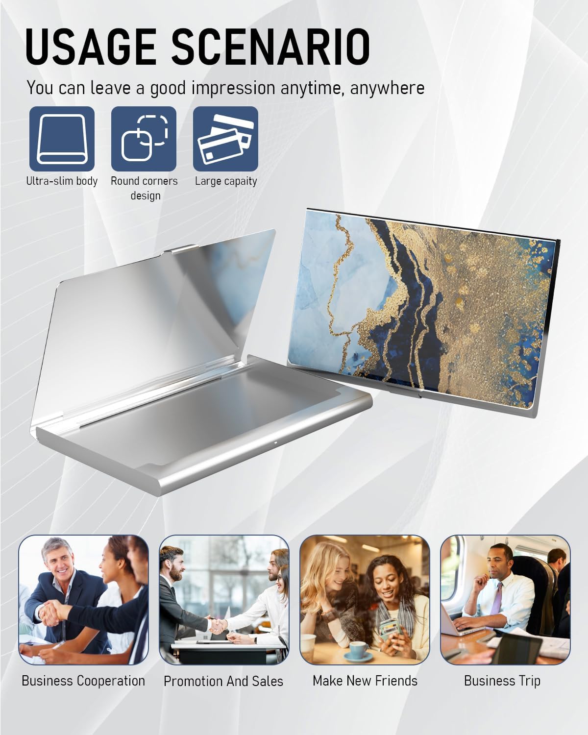 - 【Lightweight & Portable】Store at least 13 standard business cards.The small metal business card holder measures is 3.7 x 2.4 x 0.3 Inches,slides easily in your front pocket and purses.Slim business card wallet is convenient for you to use, carry, and store.