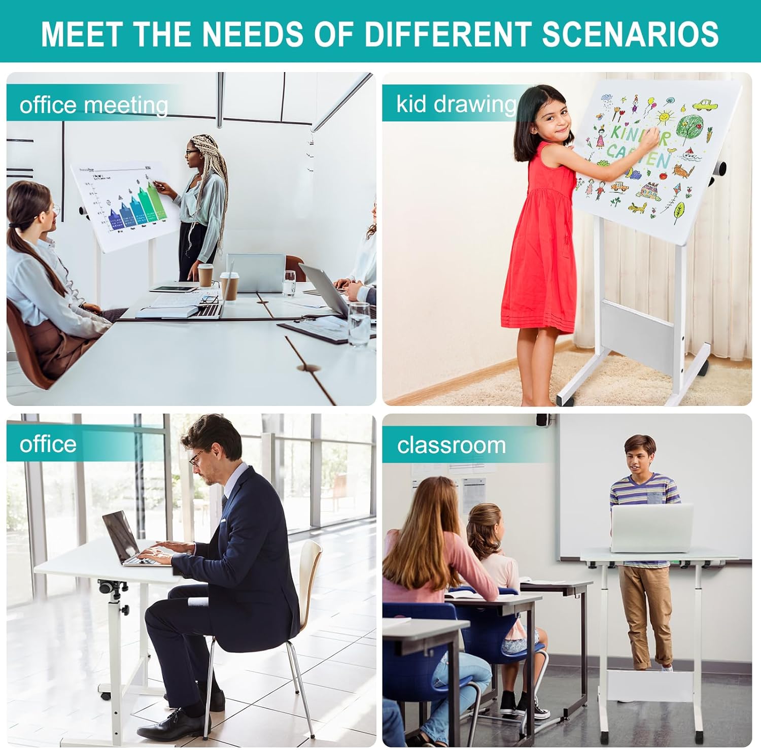 KOUPA Adjustable Height Standing Desk, Writable Tempered Glass Desktop with Eraser, 360° Flip, Wheels – Ideal for Small Spaces and Home Offices, 31 in, White(Adjustable Height: 32-47 in)