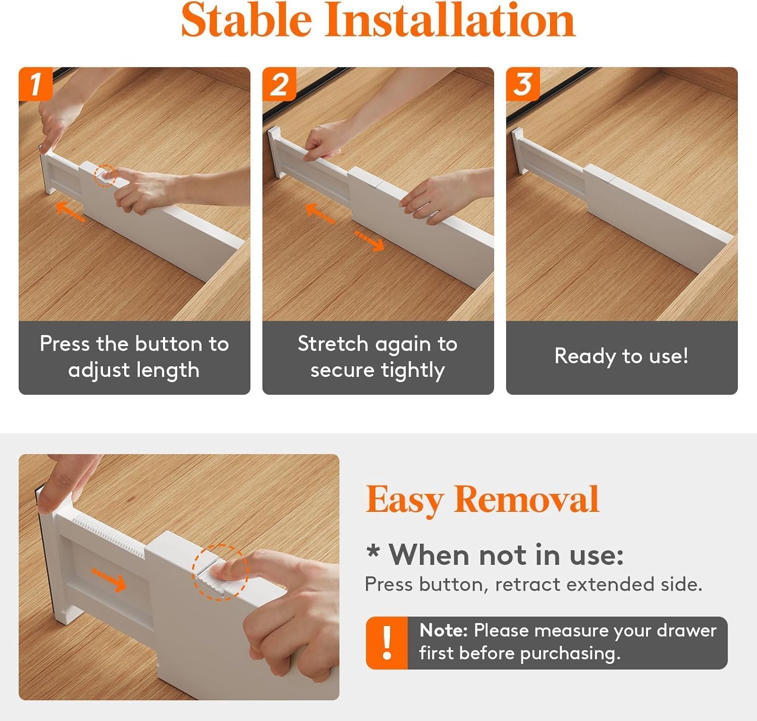 - Easy Installation & Removal: Press the top button to adjust the length before placing, and stretch it out again to secure it tightly before locking it. The strong spring tension keeps each drawer organizer securely upright. To retract, press the top button and push the stretched side.