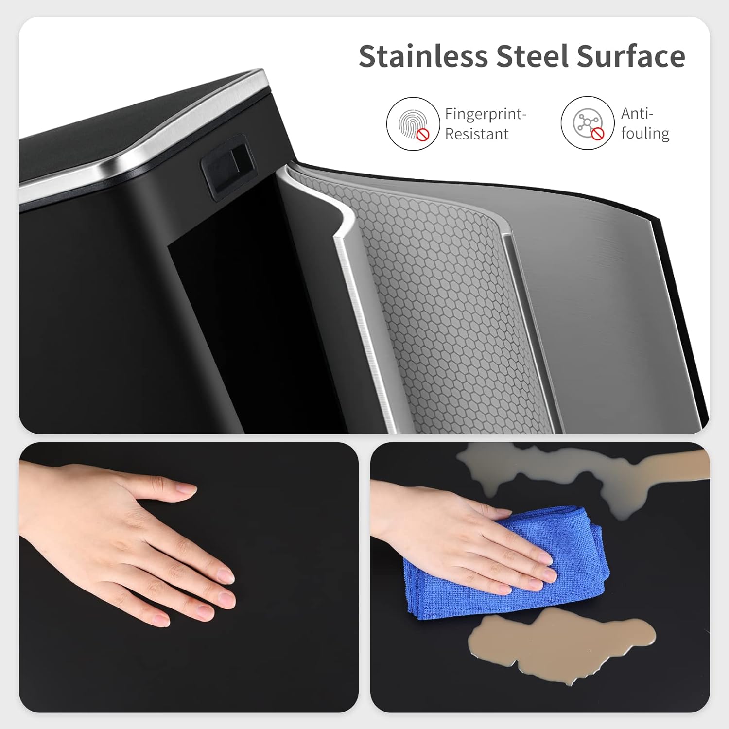 - DURABLE&STYLISH: Trash can is made of durable and fingerprint-proof stainless steel, which is easy to clean and maintain. High-quality thick 410 stainless steel has a capacity of 16 Gallon/60-Liter, perfect for homes, offices, and other spaces with high waste generation.