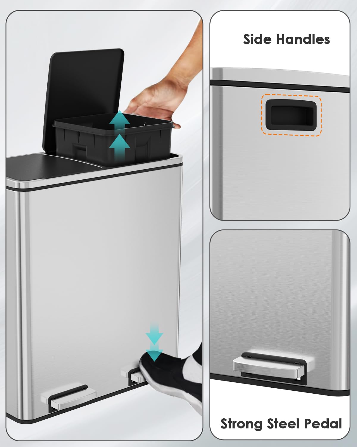- WIDEN PEDAL&SIDE HANDLES: Dual trash can includes 2 non-slip metal pedals that can open 2 lids individually, free your hands and cleaner. With 2 portable side handles, we can move it easily.