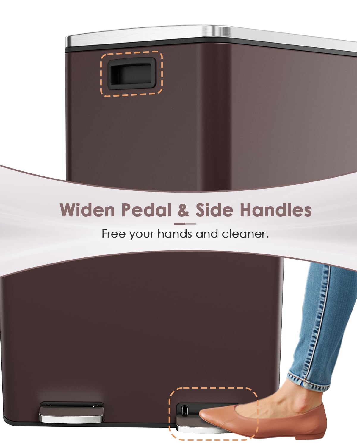 - THICK & WIDE PEDEL: Wide and thick stainless steel pedal is ergonomically designed, so you can throw out trash without bending over, and you don't need to touch the lid of the bucket when throwing out trash.